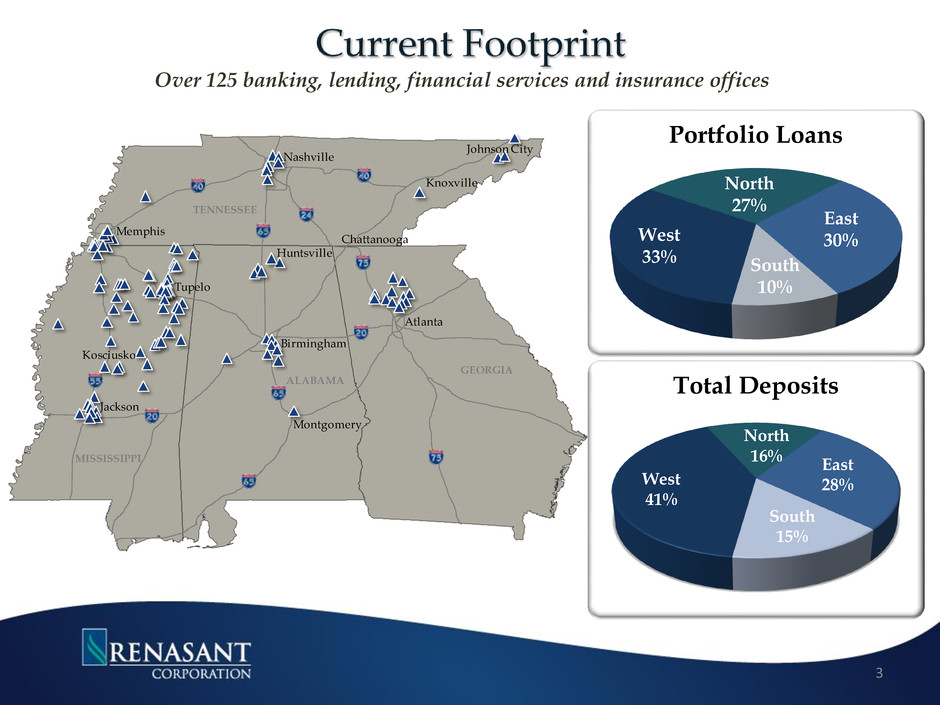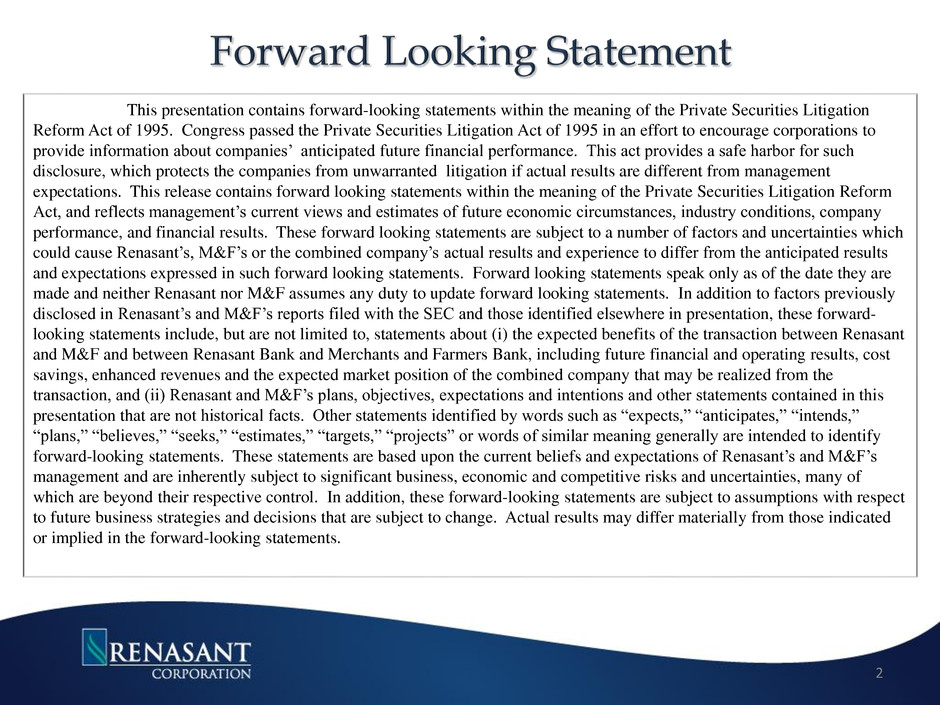 This presentation contains forward-looking statements within the meaning of the Private Securities Litigation Reform Act of 1995. Congress passed the Private Securities Litigation Act of 1995 in an effort to encourage corporations to provide information about companies’ anticipated future financial performance. This act provides a safe harbor for such disclosure, which protects the companies from unwarranted litigation if actual results are different from management expectations. This release contains forward looking statements within the meaning of the Private Securities Litigation Reform Act, and reflects management’s current views and estimates of future economic circumstances, industry conditions, company performance, and financial results. These forward looking statements are subject to a number of factors and uncertainties which could cause Renasant’s, M&F’s or the combined company’s actual results and experience to differ from the anticipated results and expectations expressed in such forward looking statements. Forward looking statements speak only as of the date they are made and neither Renasant nor M&F assumes any duty to update forward looking statements. In addition to factors previously disclosed in Renasant’s and M&F’s reports filed with the SEC and those identified elsewhere in presentation, these forward- looking statements include, but are not limited to, statements about (i) the expected benefits of the transaction between Renasant and M&F and between Renasant Bank and Merchants and Farmers Bank, including future financial and operating results, cost savings, enhanced revenues and the expected market position of the combined company that may be realized from the transaction, and (ii) Renasant and M&F’s plans, objectives, expectations and intentions and other statements contained in this presentation that are not historical facts. Other statements identified by words such as “expects,” “anticipates,” “intends,” “plans,” “believes,” “seeks,” “estimates,” “targets,” “projects” or words of similar meaning generally are intended to identify forward-looking statements. These statements are based upon the current beliefs and expectations of Renasant’s and M&F’s management and are inherently subject to significant business, economic and competitive risks and uncertainties, many of which are beyond their respective control. In addition, these forward-looking statements are subject to assumptions with respect to future business strategies and decisions that are subject to change. Actual results may differ materially from those indicated or implied in the forward-looking statements. 2