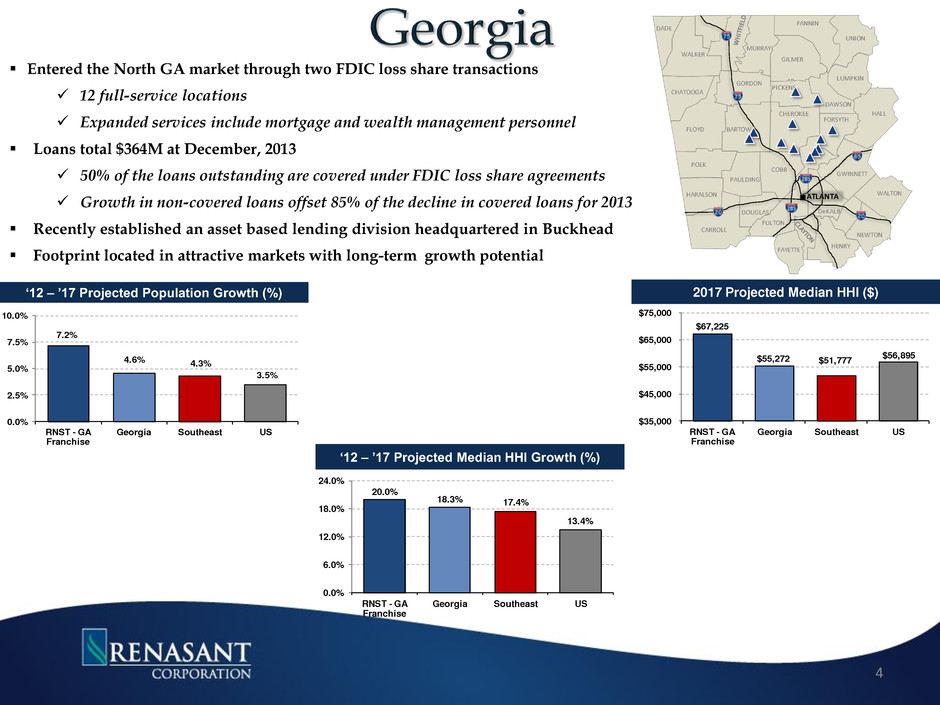 Over 125 banking, lending, financial services and insurance offices 3 West 33% North 27% East 30% South 10% Portfolio Loans West 41% North 16% East 28% South 15% Total Deposits Tupelo Nashville Atlanta Birmingham Huntsville Montgomery Jackson Memphis Kosciusko Chattanooga Johnson City Knoxville GEORGIA ALABAMA MISSISSIPPI TENNESSEE