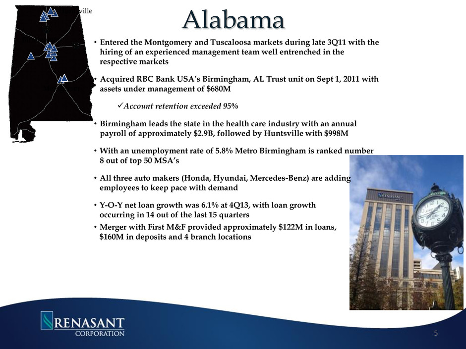 DADE WALKER CHATOOGA FLOYD POLK HARALSON CARROLL DOUGLAS FULTON FAYETTE HENRY NEWTON WALTON GWINNETT HALL LUMPKIN UNION FANNIN GILMER MURRAY GORDON BARTOW PICKENS CHEROKEE PAULDING COBB DeKALB FORSYTH DAWSON ATLANTA Entered the North GA market through two FDIC loss share transactions 12 full-service locations Expanded services include mortgage and wealth management personnel Loans total $364M at December, 2013 50% of the loans outstanding are covered under FDIC loss share agreements Growth in non-covered loans offset 85% of the decline in covered loans for 2013 Recently established an asset based lending division headquartered in Buckhead Footprint located in attractive markets with long-term growth potential 4 ‘12 – ’17 Projected Population Growth (%) 7.2% 4.6% 4.3% 3.5% 0.0% 2.5% 5.0% 7.5% 10.0% RNST - GA Franchise Georgia Southeast US ‘12 – ’17 Projected Median HHI Growth (%) 20.0% 18.3% 17.4% 13.4% 0.0% 6.0% 12.0% 18.0% 24.0% RNST - GA Franchise Georgia Southeast US 2017 Projected Median HHI ($) $67,225 $55,272 $51,777 $56,895 $35,000 $45,000 $55,000 $65,000 $75,000 RNST - GA Franchise Georgia Southeast US
