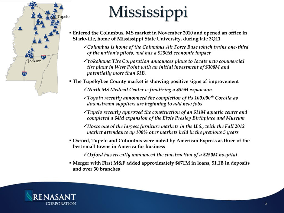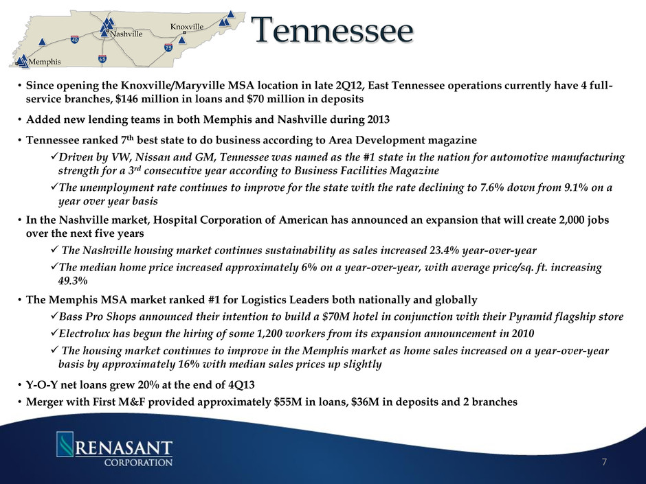 Entered the Columbus, MS market in November 2010 and opened an office in Starkville, home of Mississippi State University, during late 3Q11 Columbus is home of the Columbus Air Force Base which trains one-third of the nation’s pilots, and has a $250M economic impact Yokohama Tire Corporation announces plans to locate new commercial tire plant in West Point with an initial investment of $300M and potentially more than $1B. The Tupelo/Lee County market is showing positive signs of improvement North MS Medical Center is finalizing a $55M expansion Toyota recently announced the completion of its 100,000th Corolla as downstream suppliers are beginning to add new jobs Tupelo recently approved the construction of an $11M aquatic center and completed a $4M expansion of the Elvis Presley Birthplace and Museum Hosts one of the largest furniture markets in the U.S., with the Fall 2012 market attendance up 100% over markets held in the previous 5 years Oxford, Tupelo and Columbus were noted by American Express as three of the best small towns in America for business Oxford has recently announced the construction of a $250M hospital Merger with First M&F added approximately $671M in loans, $1.1B in deposits and over 30 branches 6 Jackson Tupelo