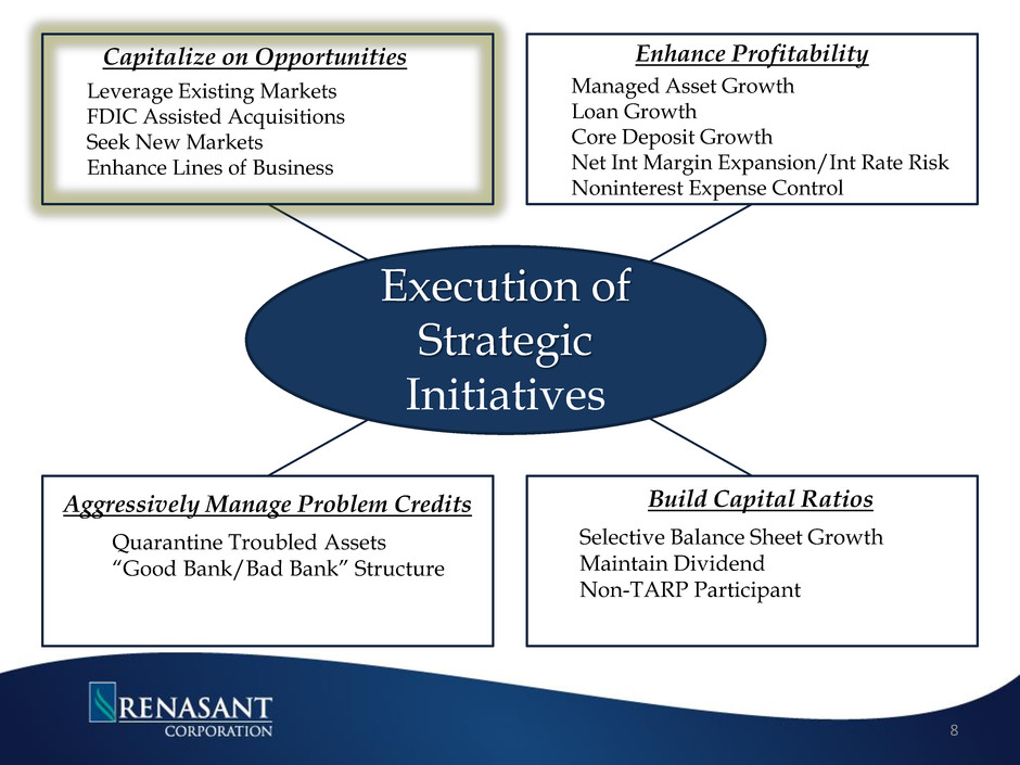 • Since opening the Knoxville/Maryville MSA location in late 2Q12, East Tennessee operations currently have 4 full- service branches, $146 million in loans and $70 million in deposits • Added new lending teams in both Memphis and Nashville during 2013 • Tennessee ranked 7th best state to do business according to Area Development magazine Driven by VW, Nissan and GM, Tennessee was named as the #1 state in the nation for automotive manufacturing strength for a 3rd consecutive year according to Business Facilities Magazine The unemployment rate continues to improve for the state with the rate declining to 7.6% down from 9.1% on a year over year basis • In the Nashville market, Hospital Corporation of American has announced an expansion that will create 2,000 jobs over the next five years The Nashville housing market continues sustainability as sales increased 23.4% year-over-year The median home price increased approximately 6% on a year-over-year, with average price/sq. ft. increasing 49.3% • The Memphis MSA market ranked #1 for Logistics Leaders both nationally and globally Bass Pro Shops announced their intention to build a $70M hotel in conjunction with their Pyramid flagship store Electrolux has begun the hiring of some 1,200 workers from its expansion announcement in 2010 The housing market continues to improve in the Memphis market as home sales increased on a year-over-year basis by approximately 16% with median sales prices up slightly • Y-O-Y net loans grew 20% at the end of 4Q13 • Merger with First M&F provided approximately $55M in loans, $36M in deposits and 2 branches 7 Nashville Memphis Knoxville