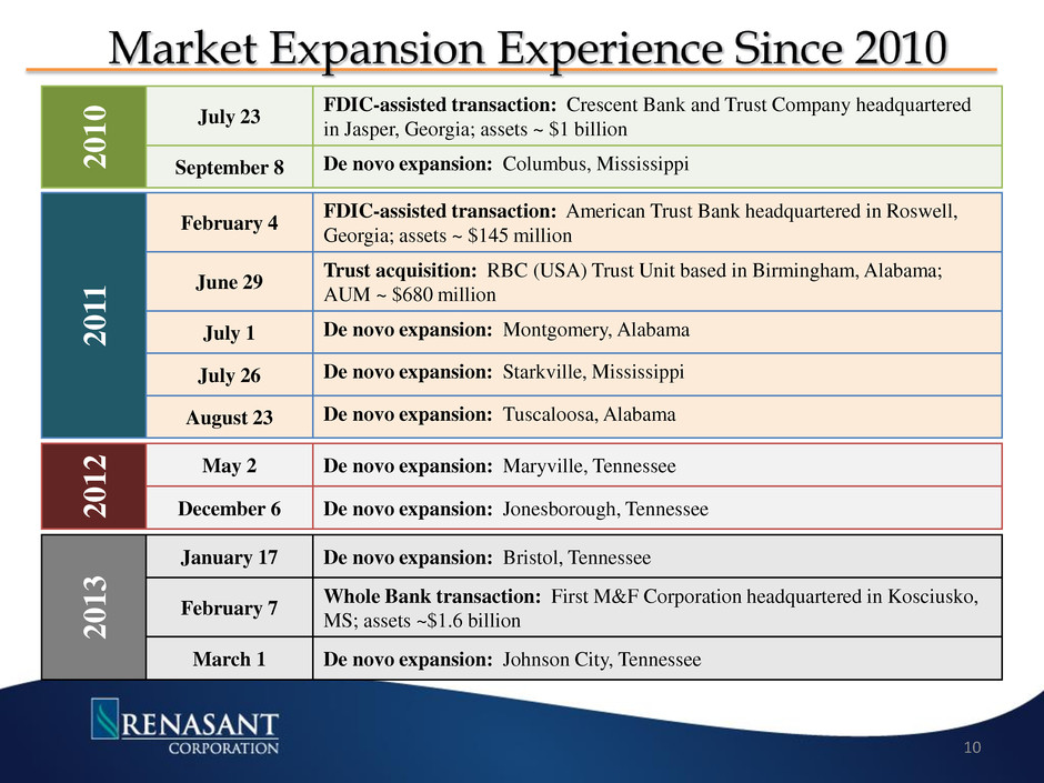 2 0 1 0 July 23 FDIC-assisted transaction: Crescent Bank and Trust Company headquartered in Jasper, Georgia; assets ~ $1 billion September 8 De novo expansion: Columbus, Mississippi 2 0 11 February 4 FDIC-assisted transaction: American Trust Bank headquartered in Roswell, Georgia; assets ~ $145 million June 29 Trust acquisition: RBC (USA) Trust Unit based in Birmingham, Alabama; AUM ~ $680 million July 1 De novo expansion: Montgomery, Alabama July 26 De novo expansion: Starkville, Mississippi August 23 De novo expansion: Tuscaloosa, Alabama 2 0 1 2 May 2 De novo expansion: Maryville, Tennessee December 6 De novo expansion: Jonesborough, Tennessee 2 0 1 3 January 17 De novo expansion: Bristol, Tennessee February 7 Whole Bank transaction: First M&F Corporation headquartered in Kosciusko, MS; assets ~$1.6 billion March 1 De novo expansion: Johnson City, Tennessee 10