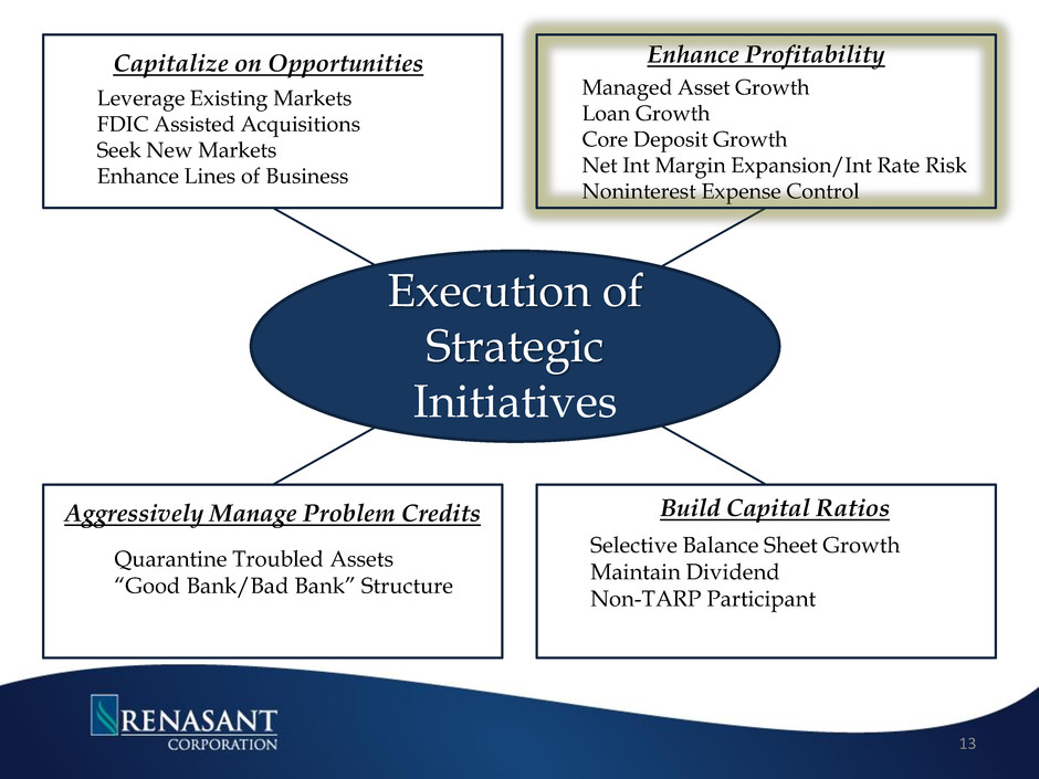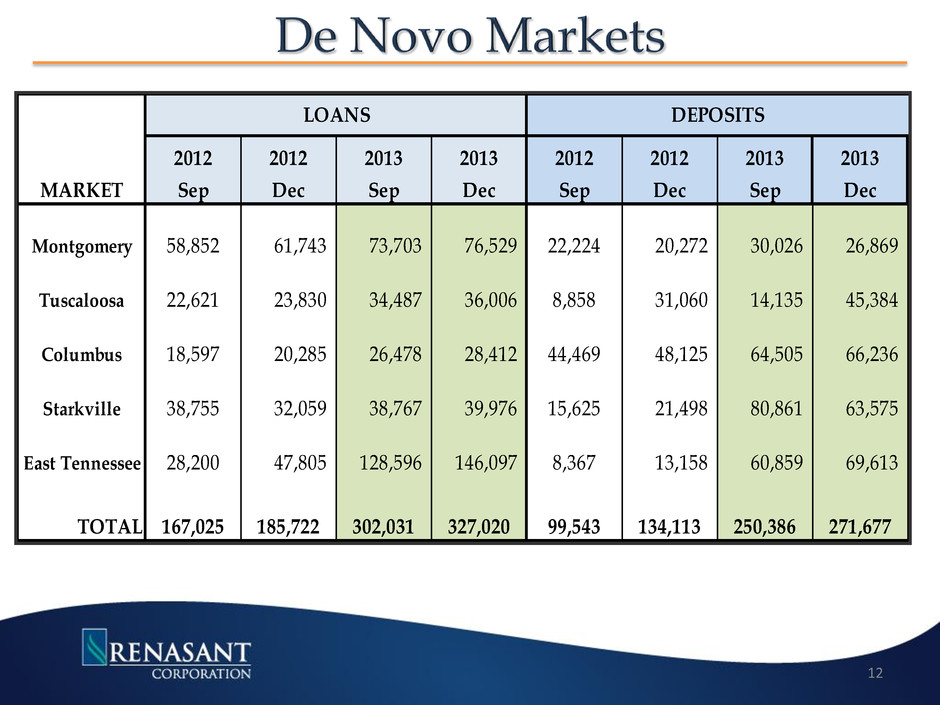 Tupelo Nashville Atlanta Birmingham Huntsville Montgomery Jackson Memphis Kosciusko Chattanooga Johnson City Knoxville GEORGIA ALABAMA MISSISSIPPI TENNESSEE Source: SNL Financial, Company documents Expansions in 2010 – 2013 RNST De Novo FMFC Acquisition 11
