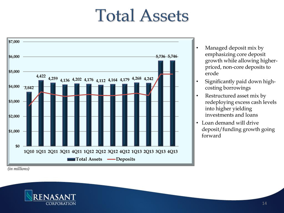 Enhance Profitability Managed Asset Growth Loan Growth Core Deposit Growth Net Int Margin Expansion/Int Rate Risk Noninterest Expense Control Execution of Strategic Initiatives Capitalize on Opportunities Leverage Existing Markets FDIC Assisted Acquisitions Seek New Markets Enhance Lines of Business Build Capital Ratios Selective Balance Sheet Growth Maintain Dividend Non-TARP Participant Aggressively Manage Problem Credits Quarantine Troubled Assets “Good Bank/Bad Bank” Structure 13