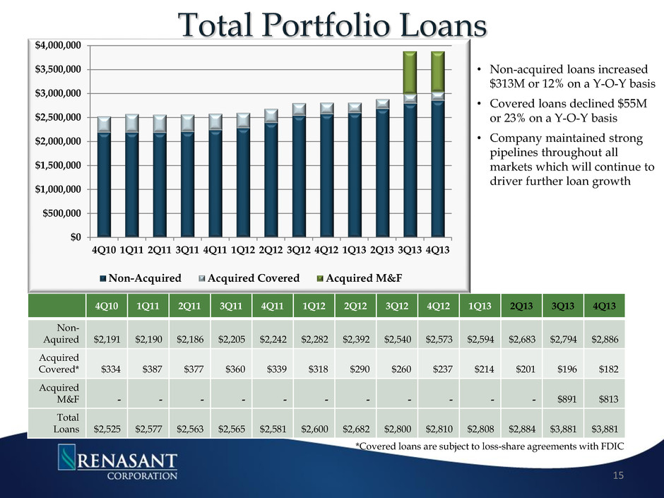 • Managed deposit mix by emphasizing core deposit growth while allowing higher- priced, non-core deposits to erode • Significantly paid down high- costing borrowings • Restructured asset mix by redeploying excess cash levels into higher yielding investments and loans • Loan demand will drive deposit/funding growth going forward 3,642 4,422 4,259 4,136 4,202 4,176 4,112 4,164 4,179 4,268 4,242 5,736 5,746 $0 $1,000 $2,000 $3,000 $4,000 $5,000 $6,000 $7,000 1Q10 1Q11 2Q11 3Q11 4Q11 1Q12 2Q12 3Q12 4Q12 1Q13 2Q13 3Q13 4Q13 Total Assets Deposits (in millions) 14