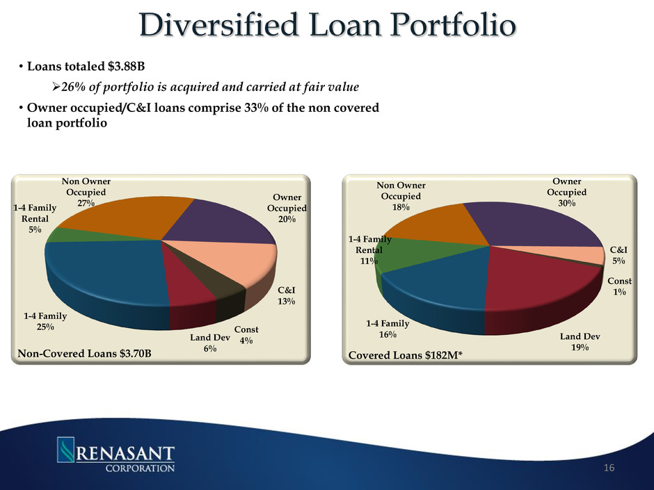 • Loans totaled $3.88B 26% of portfolio is acquired and carried at fair value • Owner occupied/C&I loans comprise 33% of the non covered loan portfolio Const 4% Land Dev 6% 1-4 Family 25% 1-4 Family Rental 5% Non Owner Occupied 27% Owner Occupied 20% C&I 13% Non-Covered Loans $3.70B Const 1% Land Dev 19% 1-4 Family 16% 1-4 Family Rental 11% Non Owner Occupied 18% Owner Occupied 30% C&I 5% Covered Loans $182M* 16