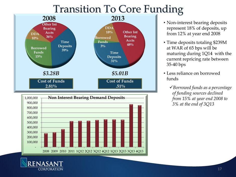 4Q10 1Q11 2Q11 3Q11 4Q11 1Q12 2Q12 3Q12 4Q12 1Q13 2Q13 3Q13 4Q13 Non- Aquired $2,191 $2,190 $2,186 $2,205 $2,242 $2,282 $2,392 $2,540 $2,573 $2,594 $2,683 $2,794 $2,886 Acquired Covered* $334 $387 $377 $360 $339 $318 $290 $260 $237 $214 $201 $196 $182 Acquired M&F - - - - - - - - - - - $891 $813 Total Loans $2,525 $2,577 $2,563 $2,565 $2,581 $2,600 $2,682 $2,800 $2,810 $2,808 $2,884 $3,881 $3,881 • Non-acquired loans increased $313M or 12% on a Y-O-Y basis • Covered loans declined $55M or 23% on a Y-O-Y basis • Company maintained strong pipelines throughout all markets which will continue to driver further loan growth $0 $500,000 $1,000,000 $1,500,000 $2,000,000 $2,500,000 $3,000,000 $3,500,000 $4,000,000 4Q10 1Q11 2Q11 3Q11 4Q11 1Q12 2Q12 3Q12 4Q12 1Q13 2Q13 3Q13 4Q13 Non-Acquired Acquired Covered Acquired M&F 15 *Covered loans are subject to loss-share agreements with FDIC
