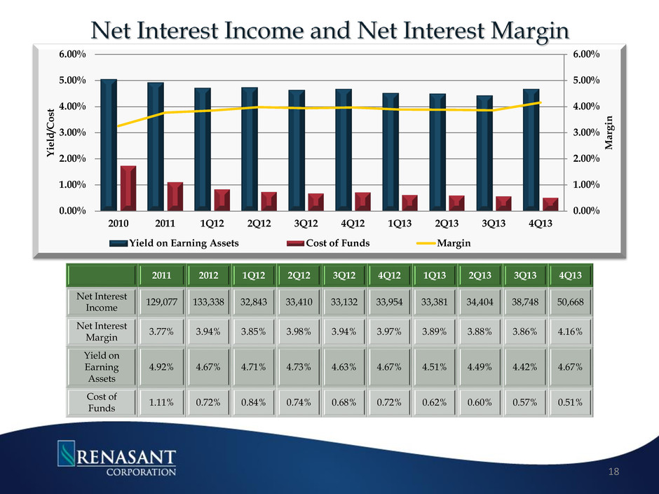 DDA 10% Other Int Bearing Accts 36% Time Deposits 39% Borrowed Funds 15% 2008 Cost of Funds 2.81% $3.28B DDA 18% Other Int Bearing Accts 48% Time Deposits 31% Borrowed Funds 3% 2013 $5.01B Cost of Funds .51% - 100,000 200,000 300,000 400,000 500,000 600,000 700,000 800,000 900,000 1,000,000 2008 2009 2010 2011 1Q12 2Q12 3Q12 4Q12 1Q13 2Q13 3Q13 4Q13 Non Interest Bearing Demand Deposits • Non-interest bearing deposits represent 18% of deposits, up from 12% at year end 2008 • Time deposits totaling $239M at WAR of 65 bps will be maturing during 1Q14 with the current repricing rate between 35-40 bps • Less reliance on borrowed funds Borrowed funds as a percentage of funding sources declined from 15% at year end 2008 to 3% at the end of 3Q13 17