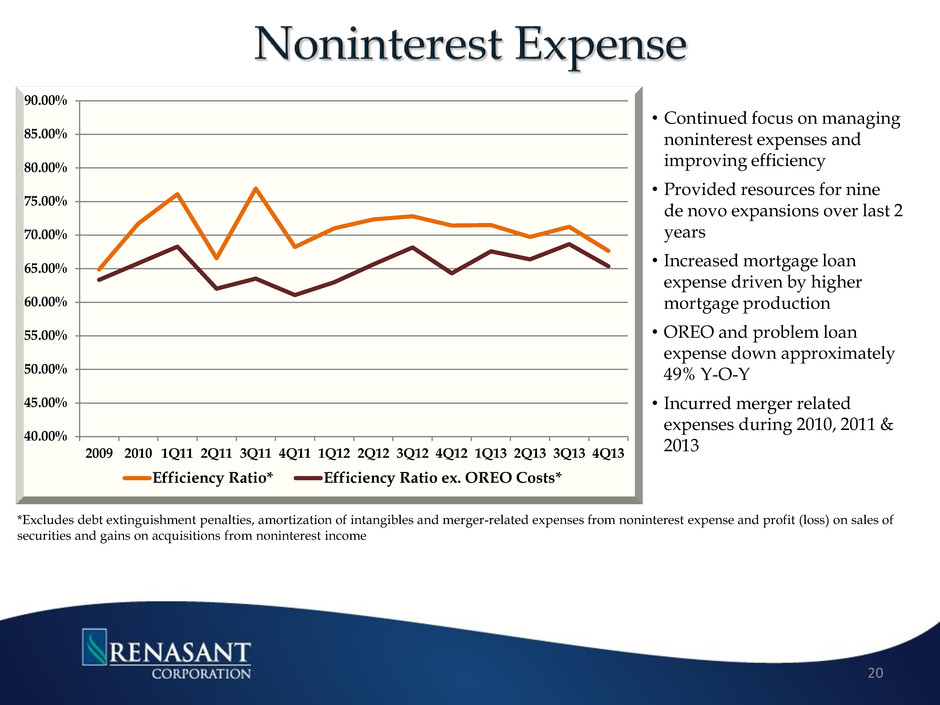 34% 10% 7% 12% 29% 8% 4Q13 $18.3M Svc Chgs Insurance Mtg Gains Wealth Mgmt Fees & Comm Other • Diversified sources of noninterest income Less reliant on NSF • Opportunities for growing Non Interest Income Expansion of Trust Division Wealth Management Services into larger, metropolitan markets Expansions within our de novo operations Expansion of the Mortgage Division within new markets Fees derived from higher penetration and usage of debit cards and deposit charges *Non interest income excludes gains from securities transactions and gains from acquisitions 39% 6% 11% 5% 27% 12% 1Q08 $13.9M Svc Chgs Insurance Mtg Gains Wealth Mgmt Fees & Comm Other - 5,000 10,000 15,000 20,000 Non Interest Income* 19