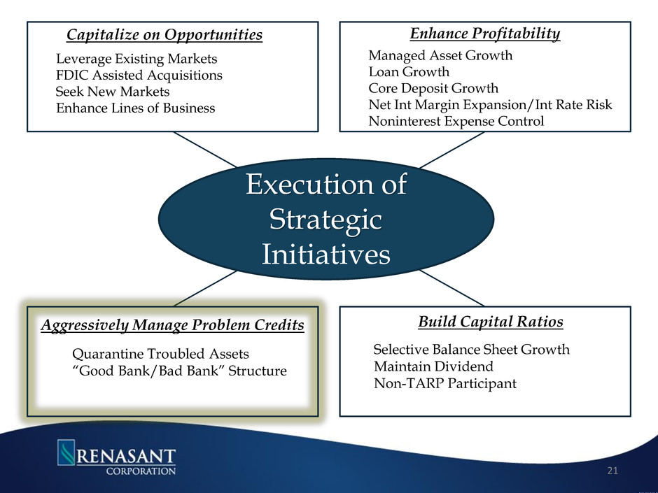 • Continued focus on managing noninterest expenses and improving efficiency • Provided resources for nine de novo expansions over last 2 years • Increased mortgage loan expense driven by higher mortgage production • OREO and problem loan expense down approximately 49% Y-O-Y • Incurred merger related expenses during 2010, 2011 & 2013 20 40.00% 45.00% 50.00% 55.00% 60.00% 65.00% 70.00% 75.00% 80.00% 85.00% 90.00% 2009 2010 1Q11 2Q11 3Q11 4Q11 1Q12 2Q12 3Q12 4Q12 1Q13 2Q13 3Q13 4Q13 Efficiency Ratio* Efficiency Ratio ex. OREO Costs* *Excludes debt extinguishment penalties, amortization of intangibles and merger-related expenses from noninterest expense and profit (loss) on sales of securities and gains on acquisitions from noninterest income