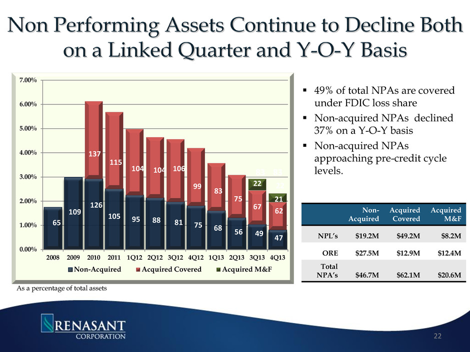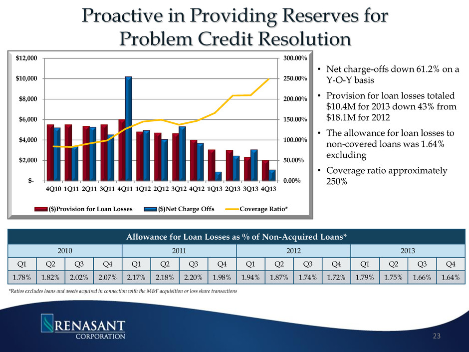 49% of total NPAs are covered under FDIC loss share Non-acquired NPAs declined 37% on a Y-O-Y basis Non-acquired NPAs approaching pre-credit cycle levels. 0.00% 1.00% 2.00% 3.00% 4.00% 5.00% 6.00% 7.00% 2008 2009 2010 2011 1Q12 2Q12 3Q12 4Q12 1Q13 2Q13 3Q13 4Q13 Non-Acquired Acquired Covered Acquired M&F 109 99 81 106 115 83 75 22 As a percentage of total assets 65 126 105 95 88 104 137 75 68 83 22 Non- Acquired Acquired Covered Acquired M&F NPL’s $19.2M $49.2M $8.2M ORE $27.5M $12.9M $12.4M Total NPA’s $46.7M $62.1M $20.6M 83 56 49 67 104 47 62 22 21