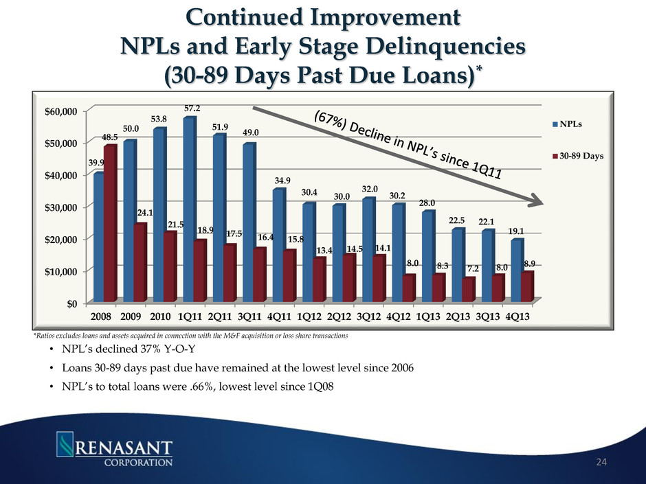*Ratios excludes loans and assets acquired in connection with the M&F acquisition or loss share transactions 0.00% 50.00% 100.00% 150.00% 200.00% 250.00% 300.00% $- $2,000 $4,000 $6,000 $8,000 $10,000 $12,000 4Q10 1Q11 2Q11 3Q11 4Q11 1Q12 2Q12 3Q12 4Q12 1Q13 2Q13 3Q13 4Q13 ($)Provision for Loan Losses ($)Net Charge Offs Coverage Ratio* • Net charge-offs down 61.2% on a Y-O-Y basis • Provision for loan losses totaled $10.4M for 2013 down 43% from $18.1M for 2012 • The allowance for loan losses to non-covered loans was 1.64% excluding • Coverage ratio approximately 250% Allowance for Loan Losses as % of Non-Acquired Loans* 2010 2011 2012 2013 Q1 Q2 Q3 Q4 Q1 Q2 Q3 Q4 Q1 Q2 Q3 Q4 Q1 Q2 Q3 Q4 1.78% 1.82% 2.02% 2.07% 2.17% 2.18% 2.20% 1.98% 1.94% 1.87% 1.74% 1.72% 1.79% 1.75% 1.66% 1.64% 23
