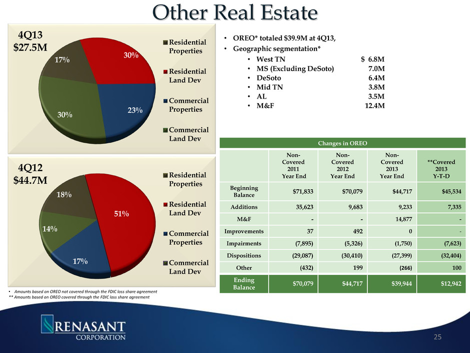 $0 $10,000 $20,000 $30,000 $40,000 $50,000 $60,000 2008 2009 2010 1Q11 2Q11 3Q11 4Q11 1Q12 2Q12 3Q12 4Q12 1Q13 2Q13 3Q13 4Q13 39.9 50.0 53.8 57.2 51.9 49.0 34.9 30.4 30.0 32.0 30.2 28.0 22.5 22.1 19.1 48.5 24.1 21.5 18.9 17.5 16.4 15.8 13.4 14.5 14.1 8.0 8.3 7.2 8.0 8.9 NPLs 30-89 Days Continued Improvement NPLs and Early Stage Delinquencies (30-89 Days Past Due Loans)* • NPL’s declined 37% Y-O-Y • Loans 30-89 days past due have remained at the lowest level since 2006 • NPL’s to total loans were .66%, lowest level since 1Q08 24 *Ratios excludes loans and assets acquired in connection with the M&F acquisition or loss share transactions