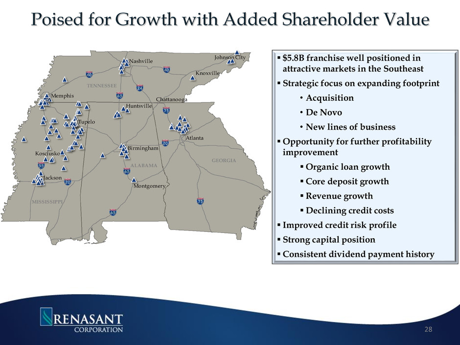 4.50% 5.00% 5.50% 6.00% 6.50% 7.00% 7.50% 8.00% 2007 2008 2009 2010 2011 1Q12 2Q12 3Q12 4Q12 1Q13 2Q13 3Q13 4Q13 Tangible Common Equity Ratio Renasant Capital 2008 2009 2010 2011 1Q12 2Q12 3Q12 4Q12 1Q13 2Q13 3Q13 4Q13 Tangible Common Equity 5.87% 6.34% 6.76% 7.35% 7.47% 7.65% 7.69% 7.71% 7.65% 7.66% 6.49% 6.64% Leverage 8.34% 8.68% 8.97% 9.44% 9.38% 9.68% 9.90% 9.86% 9.79% 9.83% 8.66% 8.68% Tier 1 Risk Based 10.85% 11.12% 13.58% 13.32% 13.32% 13.14% 12.73% 12.74% 12.86% 12.87% 11.40% 11.41% Total Risk Based 12.10% 12.37% 14.83% 14.58% 14.58% 14.39% 14.00% 14.00% 14.13% 14.14% 12.53% 12.58% • Maintained dividend throughout economic downturn • Regulatory capital ratios are above the minimum for well-capitalized classification Expected to remain “well capitalized” on a pro forma basis under the new Basel III standards • Capital level positions the Company for future growth and geographic expansion • Did not participate in the TARP program 27