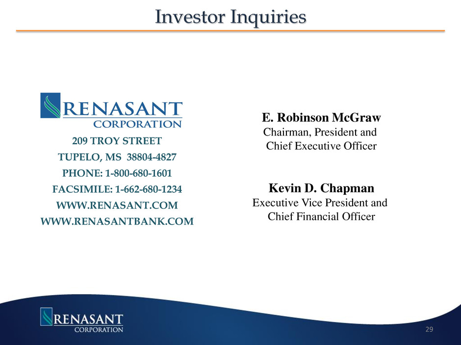 E. Robinson McGraw Chairman, President and Chief Executive Officer Kevin D. Chapman Executive Vice President and Chief Financial Officer 209 TROY STREET TUPELO, MS 38804-4827 PHONE: 1-800-680-1601 FACSIMILE: 1-662-680-1234 WWW.RENASANT.COM WWW.RENASANTBANK.COM 29