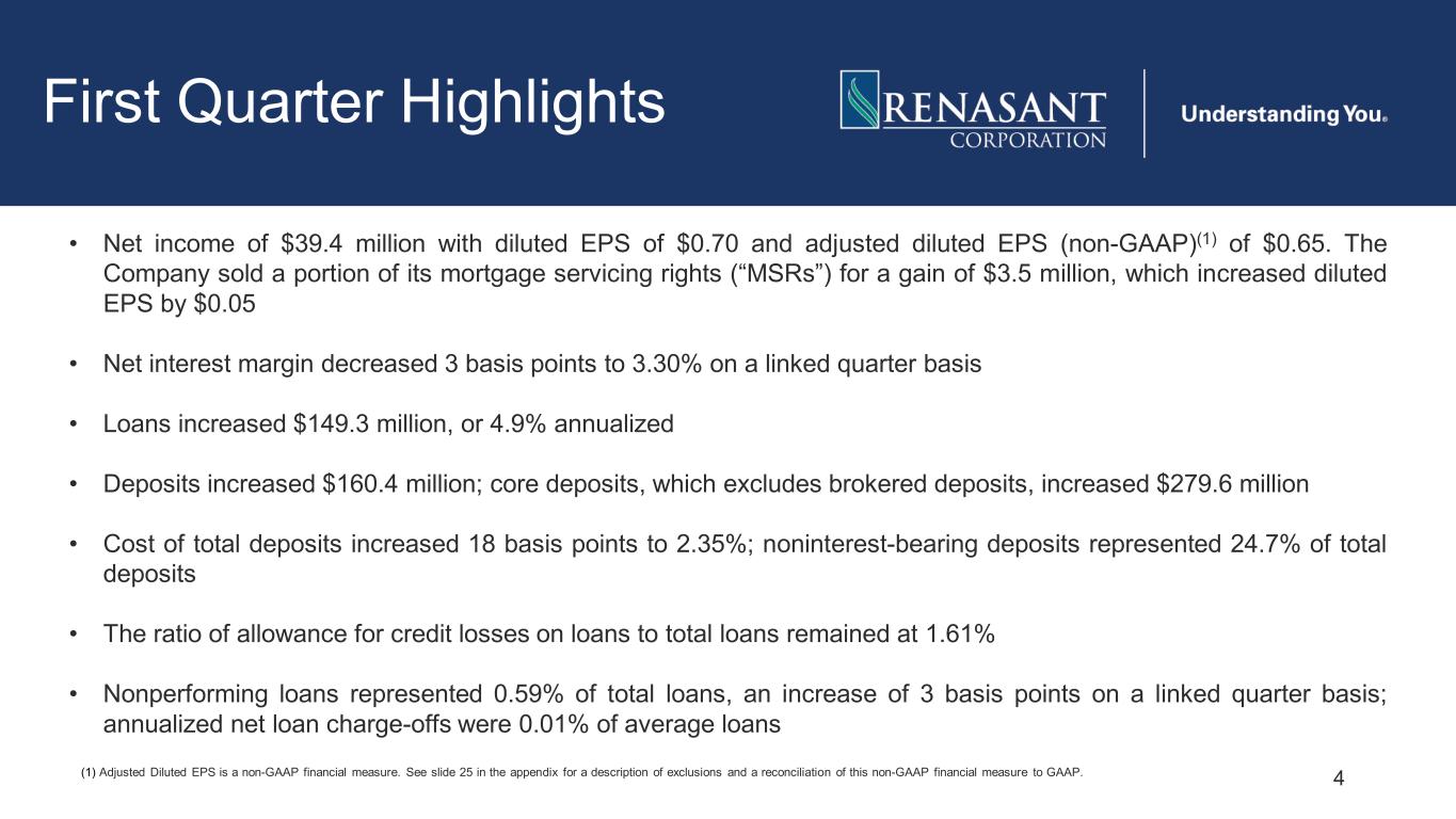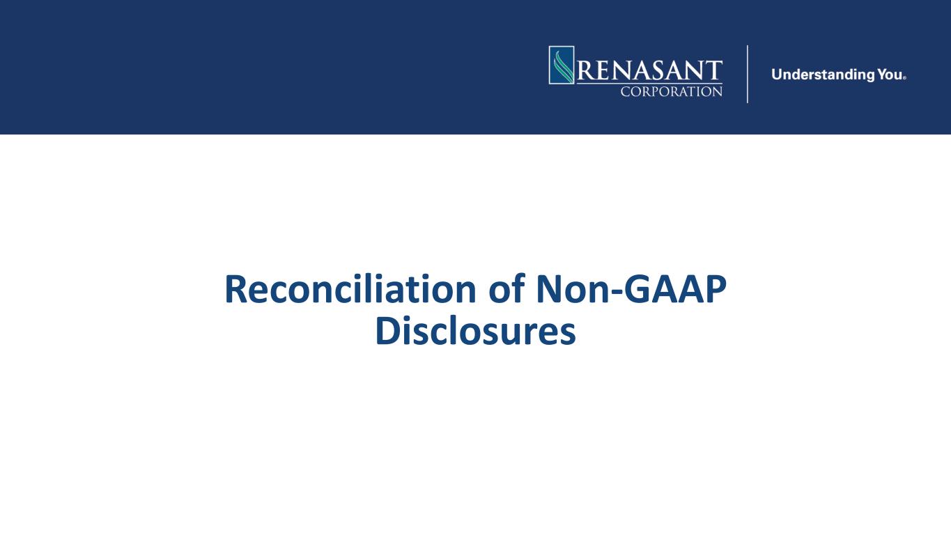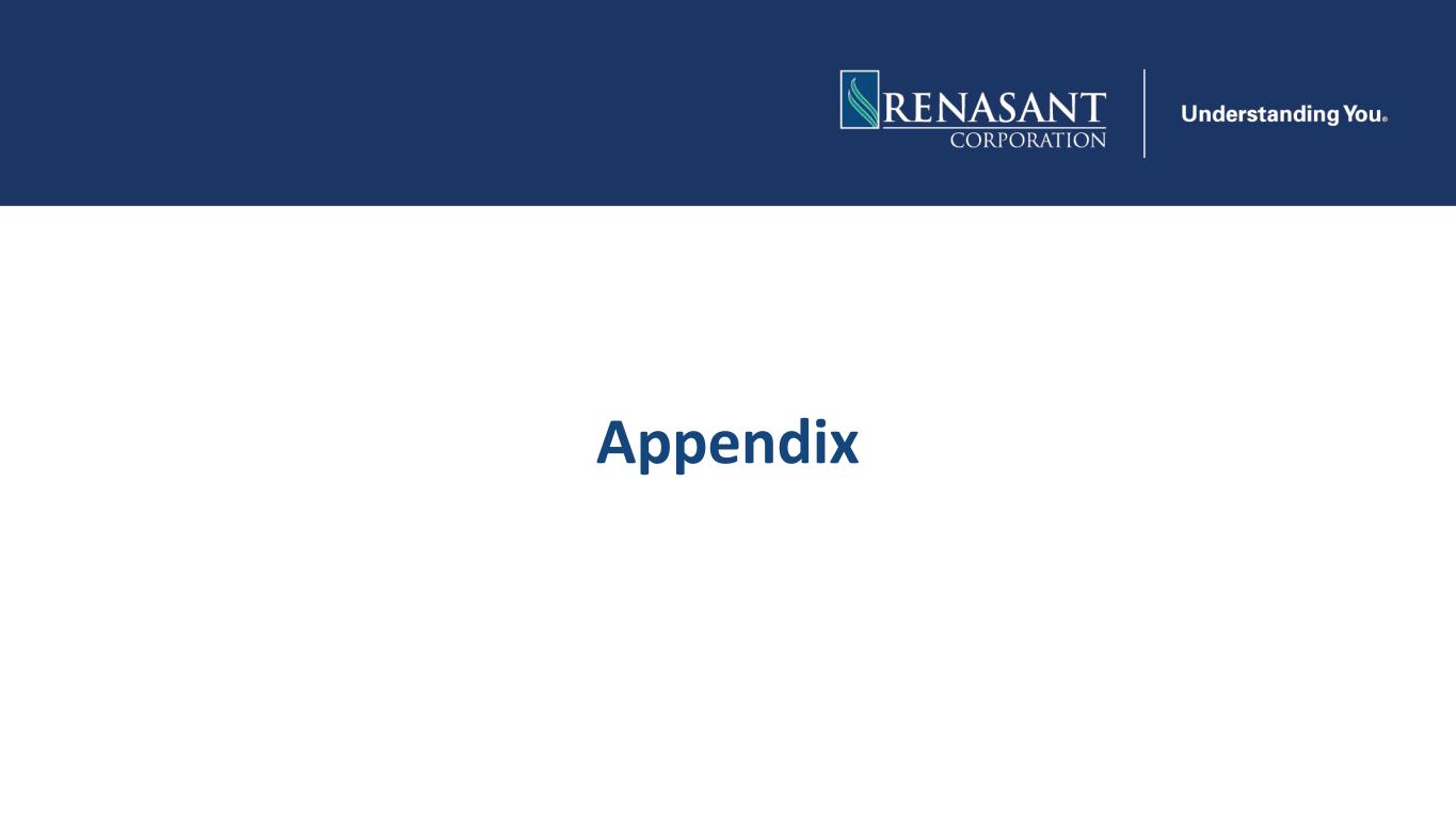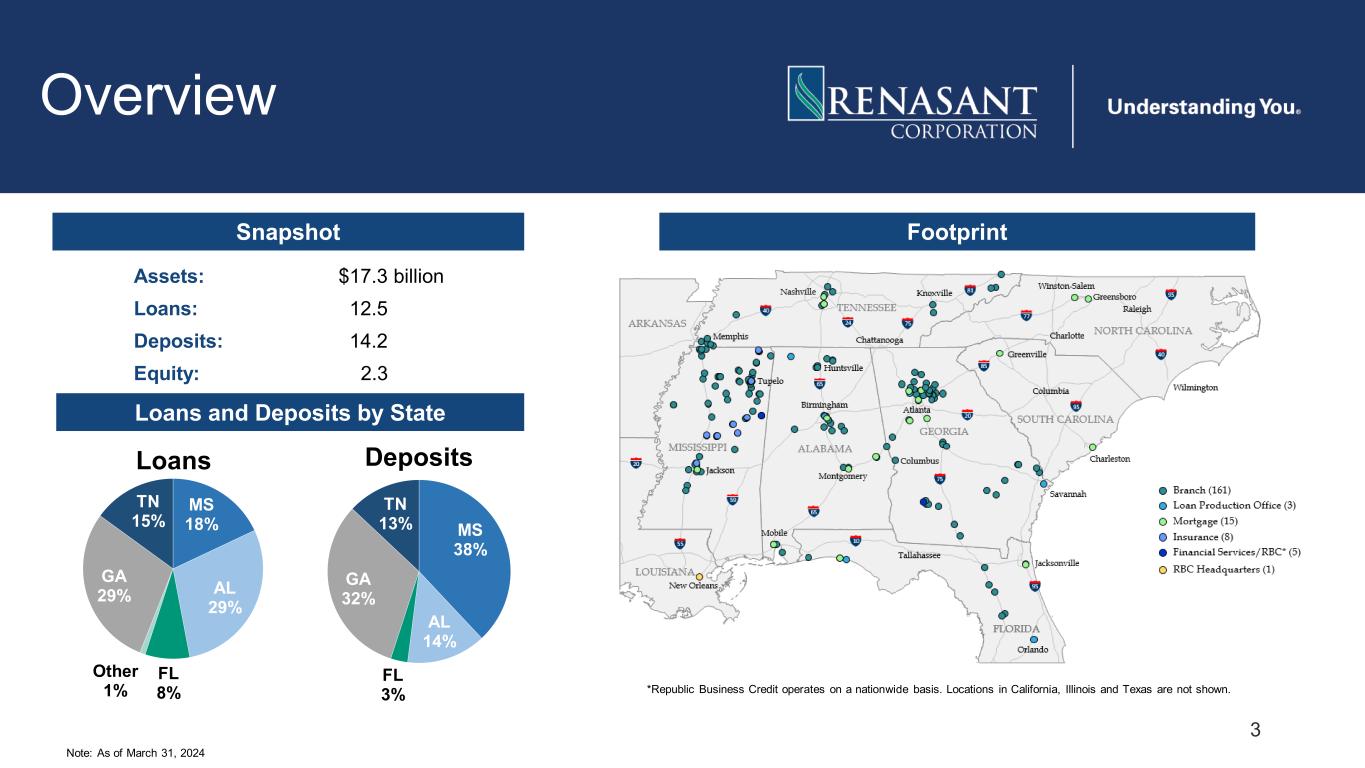 This presentation may contain various statements about Renasant Corporation (“Renasant,” “we,” “our,” or “us”) that constitute “forward-looking statements” within the meaning of Section 27A of the Securities Act of 1933, as amended, and Section 21E of the Securities Exchange Act of 1934, as amended. Statements preceded by, followed by or that otherwise include the words “believes,” “expects,” “projects,” “anticipates,” “intends,” “estimates,” “plans,” “potential,” “focus,” “possible,” “may increase,” “may fluctuate,” “will likely result,” and similar expressions, or future or conditional verbs such as “will,” “should,” “would” and “could,” are generally forward-looking in nature and not historical facts. Forward-looking statements include information about our future financial performance, business strategy, projected plans and objectives and are based on the current beliefs and expectations of management. We believe these forward-looking statements are reasonable, but they are all inherently subject to significant business, economic and competitive risks and uncertainties, many of which are beyond our control. In addition, these forward-looking statements are subject to assumptions about future business strategies and decisions that are subject to change. Actual results may differ from those indicated or implied in the forward-looking statements; such differences may be material. Prospective investors are cautioned that any forward-looking statements are not guarantees of future performance and involve risks and uncertainties. Investors should not place undue reliance on these forward-looking statements, which speak only as of the date they are made. Important factors currently known to management that could cause our actual results to differ materially from those in forward-looking statements include the following: (i) Renasant’s ability to efficiently integrate acquisitions into its operations, retain the customers of these businesses, grow the acquired operations and realize the cost savings expected from an acquisition to the extent and in the timeframe anticipated by management; (ii) the effect of economic conditions and interest rates on a national, regional or international basis; (iii) timing and success of the implementation of changes in operations to achieve enhanced earnings or effect cost savings; (iv) competitive pressures in the consumer finance, commercial finance, insurance, financial services, asset management, retail banking, factoring and mortgage lending and auto lending industries; (v) the financial resources of, and products available from, competitors; (vi) changes in laws and regulations as well as changes in accounting standards; (vii) changes in policy by regulatory agencies; (viii) changes in the securities and foreign exchange markets; (ix) Renasant’s potential growth, including its entrance or expansion into new markets, and the need for sufficient capital to support that growth; (x) changes in the quality or composition of our loan or investment portfolios, including adverse developments in borrower industries or the repayment ability of individual borrowers or issuers of investment securities, or the impact of interest rates on the value of our investment securities portfolio; (xi) an insufficient allowance for credit losses as a result of inaccurate assumptions; (xii) changes in the sources and costs of the capital we use to make loans and otherwise fund our operations, due to deposit outflows, changes in the mix of deposits and the cost and availability of borrowings; (xiii) general economic, market or business conditions, including the impact of inflation; (xiv) changes in demand for loan products and financial services; (xv) concentration of deposit and credit exposure; (xvi) changes or the lack of changes in interest rates, yield curves and interest rate spread relationships; (xvii) increased cybersecurity risk, including potential network breaches, business disruptions or financial losses; (xviii) civil unrest, natural disasters, epidemics and other catastrophic events in our geographic area; (xix) the impact, extent and timing of technological changes; and (xx) other circumstances, many of which are beyond management’s control. Management believes that the assumptions underlying our forward-looking statements are reasonable, but any of the assumptions could prove to be inaccurate. Investors are urged to carefully consider the risks described in Renasant’s filings with the Securities and Exchange Commission (“SEC”) from time to time, including its most recent Annual Report on Form 10-K and subsequent Quarterly Reports on Form 10-Q, which are available at www.renasant.com and the SEC’s website at www.sec.gov. We undertake no obligation, and specifically disclaim any obligation, to update or revise our forward-looking statements, whether as a result of new information or to reflect changed assumptions, the occurrence of unanticipated events or changes to future operating results over time, except as required by federal securities laws. 2 Forward-Looking Statements