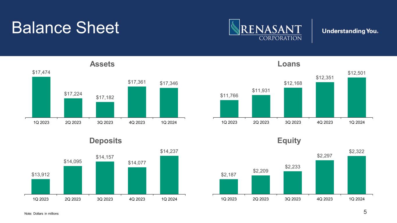 4 First Quarter Highlights • Net income of $39.4 million with diluted EPS of $0.70 and adjusted diluted EPS (non-GAAP)(1) of $0.65. The Company sold a portion of its mortgage servicing rights (“MSRs”) for a gain of $3.5 million, which increased diluted EPS by $0.05 • Net interest margin decreased 3 basis points to 3.30% on a linked quarter basis • Loans increased $149.3 million, or 4.9% annualized • Deposits increased $160.4 million; core deposits, which excludes brokered deposits, increased $279.6 million • Cost of total deposits increased 18 basis points to 2.35%; noninterest-bearing deposits represented 24.7% of total deposits • The ratio of allowance for credit losses on loans to total loans remained at 1.61% • Nonperforming loans represented 0.59% of total loans, an increase of 3 basis points on a linked quarter basis; annualized net loan charge-offs were 0.01% of average loans (1) Adjusted Diluted EPS is a non-GAAP financial measure. See slide 25 in the appendix for a description of exclusions and a reconciliation of this non-GAAP financial measure to GAAP.