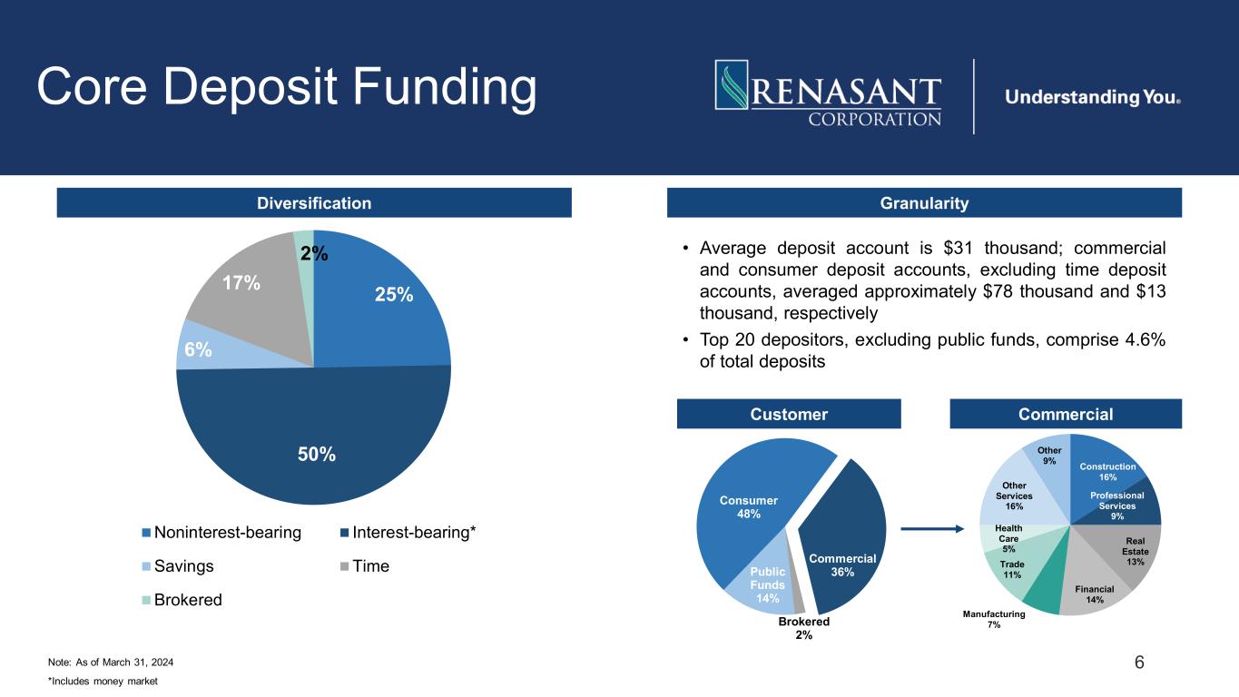 5 Balance Sheet $17,474 $17,224 $17,182 $17,361 $17,346 $17,000 $17,050 $17,100 $17,150 $17,200 $17,250 $17,300 $17,350 $17,400 $17,450 $17,500 1Q 2023 2Q 2023 3Q 2023 4Q 2023 1Q 2024 Assets $11,766 $11,931 $12,168 $12,351 $12,501 $11,200 $11,400 $11,600 $11,800 $12,000 $12,200 $12,400 $12,600 1Q 2023 2Q 2023 3Q 2023 4Q 2023 1Q 2024 Loans $13,912 $14,095 $14,157 $14,077 $14,237 $13,700 $13,800 $13,900 $14,000 $14,100 $14,200 $14,300 1Q 2023 2Q 2023 3Q 2023 4Q 2023 1Q 2024 Deposits $2,187 $2,209 $2,233 $2,297 $2,322 $2,100 $2,150 $2,200 $2,250 $2,300 $2,350 1Q 2023 2Q 2023 3Q 2023 4Q 2023 1Q 2024 Equity Note: Dollars in millions Note: In millions