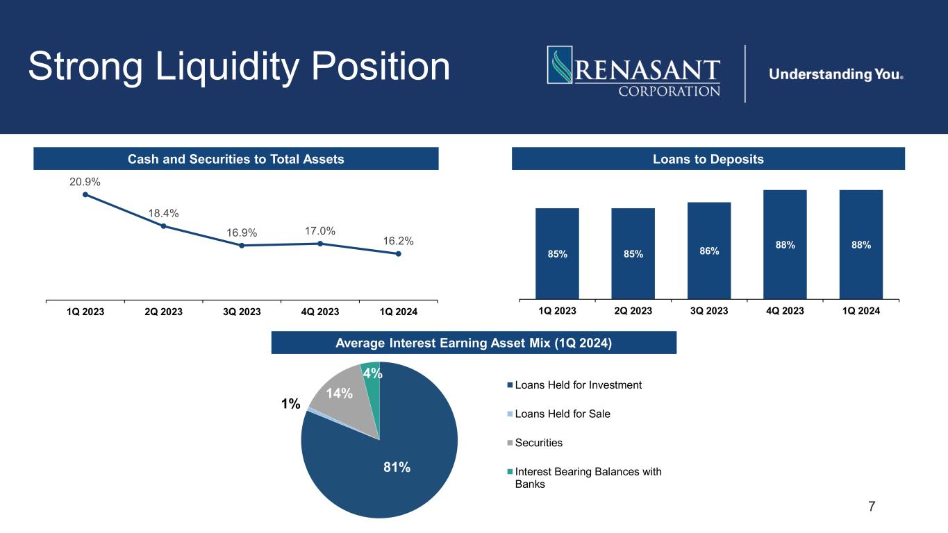 6 Core Deposit Funding 25% 50% 6% 17% 2% Noninterest-bearing Interest-bearing* Savings Time Brokered • Average deposit account is $31 thousand; commercial and consumer deposit accounts, excluding time deposit accounts, averaged approximately $78 thousand and $13 thousand, respectively • Top 20 depositors, excluding public funds, comprise 4.6% of total deposits Diversification Note: As of March 31, 2024 *Includes money market Consumer 48% Commercial 36% Brokered 2% Public Funds 14% CommercialCustomer Construction 16% Professional Services 9% Real Estate 13% Financial 14% Manufacturing 7% Trade 11% Health Care 5% Other Services 16% Other 9% Granularity