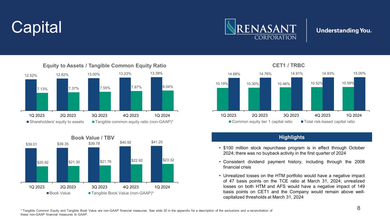 7 Strong Liquidity Position 85% 85% 86% 88% 88% $1 $1 $1 $1 $1 $1 $1 $1 $1 $1 $1 1Q 2023 2Q 2023 3Q 2023 4Q 2023 1Q 2024 Loans to Deposits 20.9% 18.4% 16.9% 17.0% 16.2% $0 $0 $0 $0 $0 $0 $0 $0 $0 $0 1Q 2023 2Q 2023 3Q 2023 4Q 2023 1Q 2024 Cash and Securities to Total Assets Average Interest Earning Asset Mix (1Q 2024) 81% 1% 14% 4% Loans Held for Investment Loans Held for Sale Securities Interest Bearing Balances with Banks