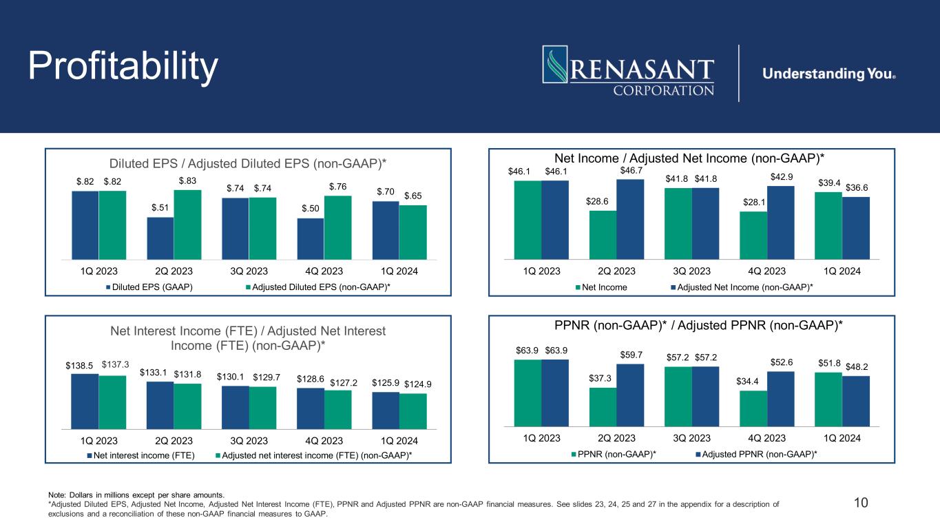 9 Asset Quality 2.44% 2.32% 2.27% 2.16% 2.76% 2.00% 2.50% 3.00% 3.50% 4.00% 1Q 2023 2Q 2023 3Q 2023 4Q 2023 1Q 2024 Criticized Loans/Total Loans 0.43% 0.10% 0.11% 0.44% 0.48% 0.0% 0.5% 1.0% 1Q 2023 2Q 2023 3Q 2023 4Q 2023 1Q 2024 Loans 30-89 Days Past Due/ Total Loans 0.16% 0.13% 0.06% 0.06% 0.01% 0.0% 0.5% 1.0% 1Q 2023 2Q 2023 3Q 2023 4Q 2023 1Q 2024 Net Charge-offs / Average Loans 1.66% 1.63% 1.63% 1.61% 1.61% 0.0% 1.0% 2.0% 1Q 2023 2Q 2023 3Q 2023 4Q 2023 1Q 2024 Allowance/Total Loans 259% 212% 282% 286% 271% 0% 200% 400% 1Q 2023 2Q 2023 3Q 2023 4Q 2023 1Q 2024 Allowance/Nonperforming Loans 0.46% 0.56% 0.46% 0.46% 0.48% 0.0% 0.5% 1.0% 1Q 2023 2Q 2023 3Q 2023 4Q 2023 1Q 2024 NPAs/Total Assets