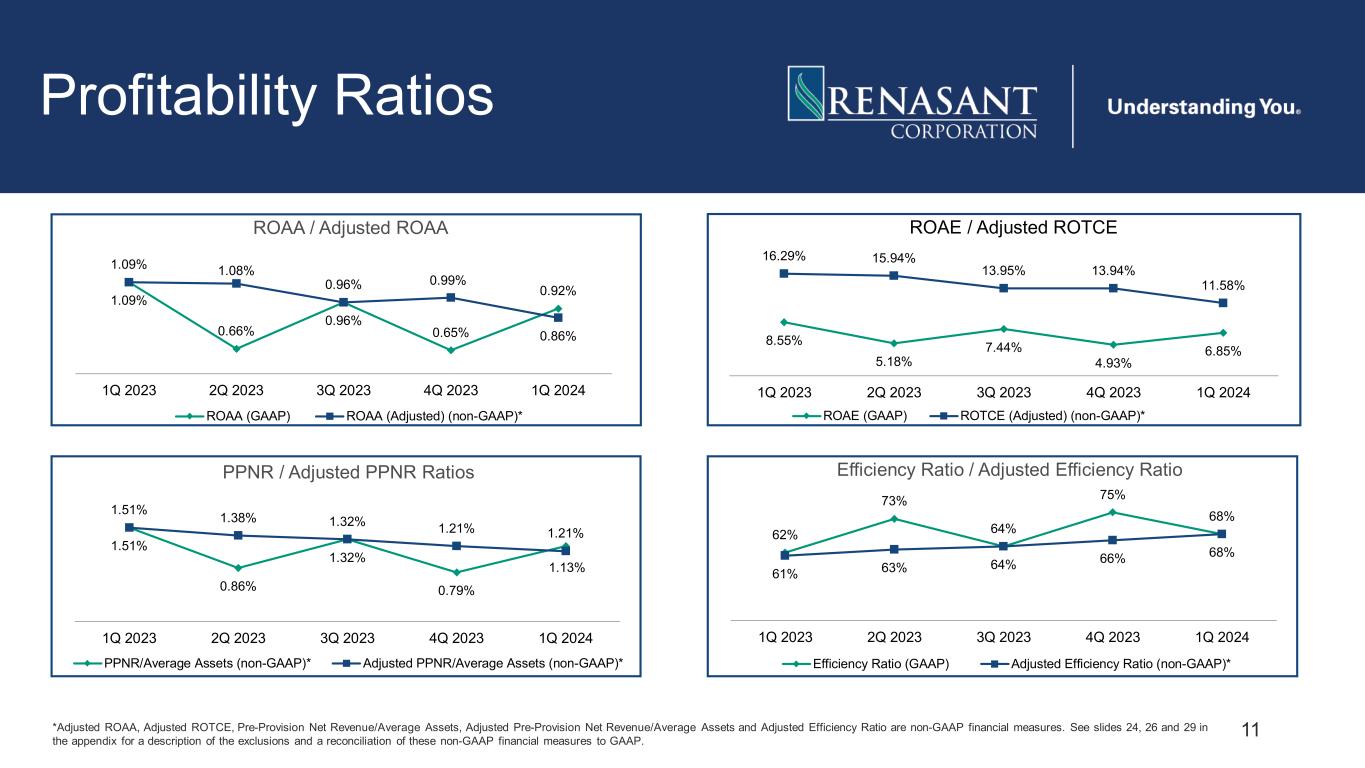 10 Profitability Note: Dollars in millions except per share amounts. *Adjusted Diluted EPS, Adjusted Net Income, Adjusted Net Interest Income (FTE), PPNR and Adjusted PPNR are non-GAAP financial measures. See slides 23, 24, 25 and 27 in the appendix for a description of exclusions and a reconciliation of these non-GAAP financial measures to GAAP. $.82 $.51 $.74 $.50 $.70 $.82 $.83 $.74 $.76 $.65 1Q 2023 2Q 2023 3Q 2023 4Q 2023 1Q 2024 Diluted EPS / Adjusted Diluted EPS (non-GAAP)* Diluted EPS (GAAP) Adjusted Diluted EPS (non-GAAP)* $46.1 $28.6 $41.8 $28.1 $39.4 $46.1 $46.7 $41.8 $42.9 $36.6 1Q 2023 2Q 2023 3Q 2023 4Q 2023 1Q 2024 Net Income / Adjusted Net Income (non-GAAP)* Net Income Adjusted Net Income (non-GAAP)* $138.5 $133.1 $130.1 $128.6 $125.9 $137.3 $131.8 $129.7 $127.2 $124.9 1Q 2023 2Q 2023 3Q 2023 4Q 2023 1Q 2024 Net Interest Income (FTE) / Adjusted Net Interest Income (FTE) (non-GAAP)* Net interest income (FTE) Adjusted net interest income (FTE) (non-GAAP)* $63.9 $37.3 $57.2 $34.4 $51.8 $63.9 $59.7 $57.2 $52.6 $48.2 1Q 2023 2Q 2023 3Q 2023 4Q 2023 1Q 2024 PPNR (non-GAAP)* / Adjusted PPNR (non-GAAP)* PPNR (non-GAAP)* Adjusted PPNR (non-GAAP)*
