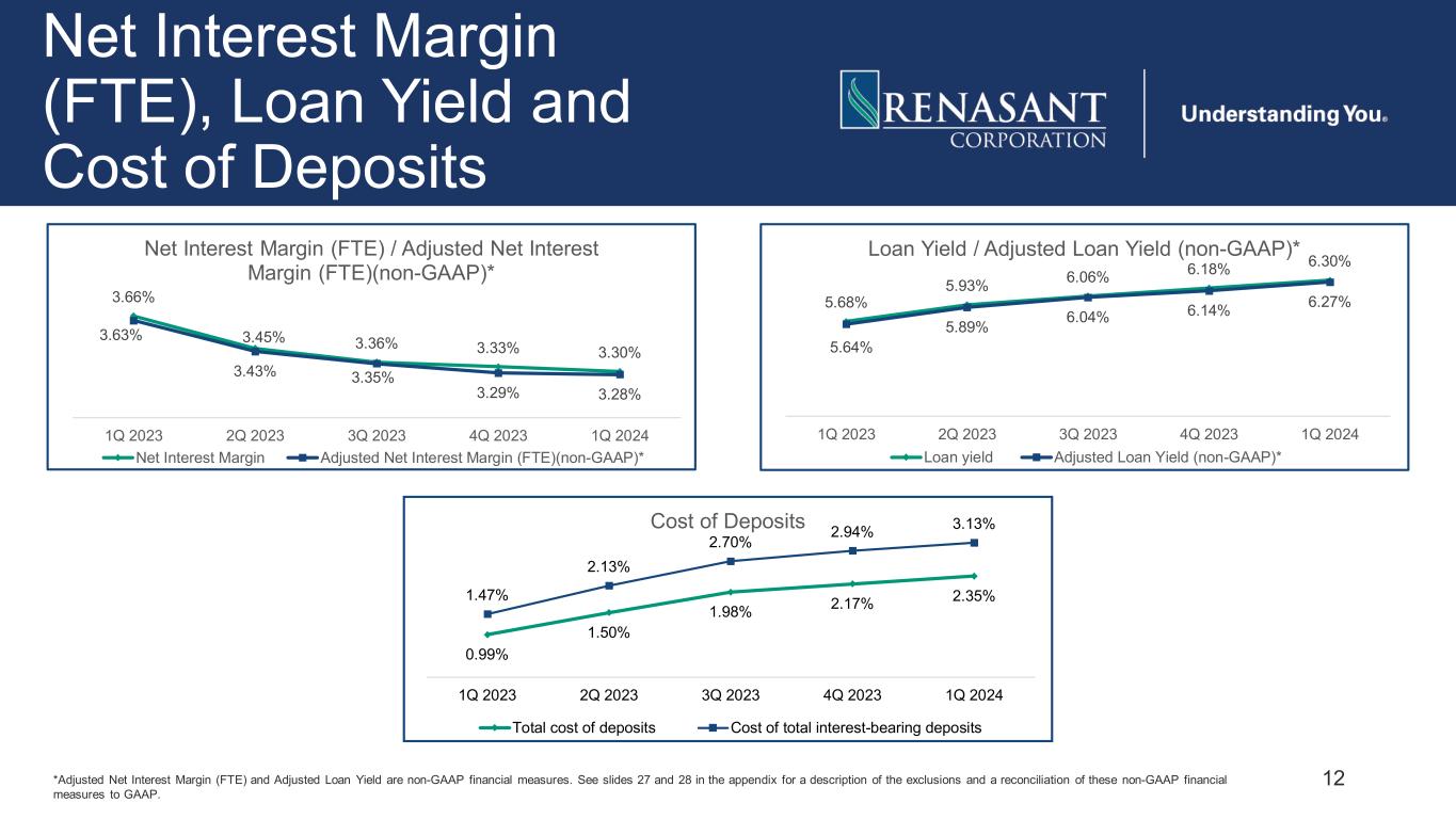 11 Profitability Ratios *Adjusted ROAA, Adjusted ROTCE, Pre-Provision Net Revenue/Average Assets, Adjusted Pre-Provision Net Revenue/Average Assets and Adjusted Efficiency Ratio are non-GAAP financial measures. See slides 24, 26 and 29 in the appendix for a description of the exclusions and a reconciliation of these non-GAAP financial measures to GAAP. 8.55% 5.18% 7.44% 4.93% 6.85% 16.29% 15.94% 13.95% 13.94% 11.58% 1Q 2023 2Q 2023 3Q 2023 4Q 2023 1Q 2024 ROAE / Adjusted ROTCE ROAE (GAAP) ROTCE (Adjusted) (non-GAAP)* 1.09% 0.66% 0.96% 0.65% 0.92% 1.09% 1.08% 0.96% 0.99% 0.86% 1Q 2023 2Q 2023 3Q 2023 4Q 2023 1Q 2024 ROAA / Adjusted ROAA ROAA (GAAP) ROAA (Adjusted) (non-GAAP)* 62% 73% 64% 75% 68% 61% 63% 64% 66% 68% 1Q 2023 2Q 2023 3Q 2023 4Q 2023 1Q 2024 Efficiency Ratio / Adjusted Efficiency Ratio Efficiency Ratio (GAAP) Adjusted Efficiency Ratio (non-GAAP)* 1.51% 0.86% 1.32% 0.79% 1.21% 1.51% 1.38% 1.32% 1.21% 1.13% 1Q 2023 2Q 2023 3Q 2023 4Q 2023 1Q 2024 PPNR / Adjusted PPNR Ratios PPNR/Average Assets (non-GAAP)* Adjusted PPNR/Average Assets (non-GAAP)*