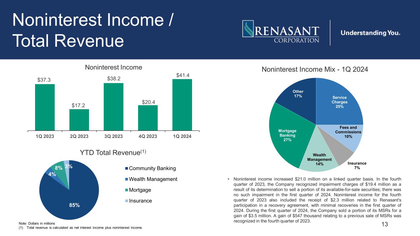 12 Net Interest Margin (FTE), Loan Yield and Cost of Deposits 3.66% 3.45% 3.36% 3.33% 3.30% 3.63% 3.43% 3.35% 3.29% 3.28% 1Q 2023 2Q 2023 3Q 2023 4Q 2023 1Q 2024 Net Interest Margin (FTE) / Adjusted Net Interest Margin (FTE)(non-GAAP)* Net Interest Margin Adjusted Net Interest Margin (FTE)(non-GAAP)* 5.68% 5.93% 6.06% 6.18% 6.30% 5.64% 5.89% 6.04% 6.14% 6.27% 1Q 2023 2Q 2023 3Q 2023 4Q 2023 1Q 2024 Loan Yield / Adjusted Loan Yield (non-GAAP)* Loan yield Adjusted Loan Yield (non-GAAP)* *Adjusted Net Interest Margin (FTE) and Adjusted Loan Yield are non-GAAP financial measures. See slides 27 and 28 in the appendix for a description of the exclusions and a reconciliation of these non-GAAP financial measures to GAAP. 0.99% 1.50% 1.98% 2.17% 2.35%1.47% 2.13% 2.70% 2.94% 3.13% 1Q 2023 2Q 2023 3Q 2023 4Q 2023 1Q 2024 Cost of Deposits Total cost of deposits Cost of total interest-bearing deposits