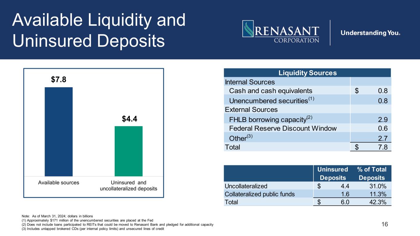 16 Available Liquidity and Uninsured Deposits Note: As of March 31, 2024; dollars in billions (1) Approximately $171 million of the unencumbered securities are placed at the Fed (2) Does not include loans participated to REITs that could be moved to Renasant Bank and pledged for additional capacity (3) Includes untapped brokered CDs (per internal policy limits) and unsecured lines of credit $7.8 $4.4 Available sources Uninsured and uncollateralized deposits Uninsured Deposits % of Total Deposits Uncollateralized 4.4$ 31.0% Collateralized public funds 1.6 11.3% Total 6.0$ 42.3% Internal Sources Cash and cash equivalents 0.8$ Unencumbered securities(1) 0.8 External Sources FHLB borrowing capacity(2) 2.9 Federal Reserve Discount Window 0.6 Other(3) 2.7 Total 7.8$ Liquidity Sources