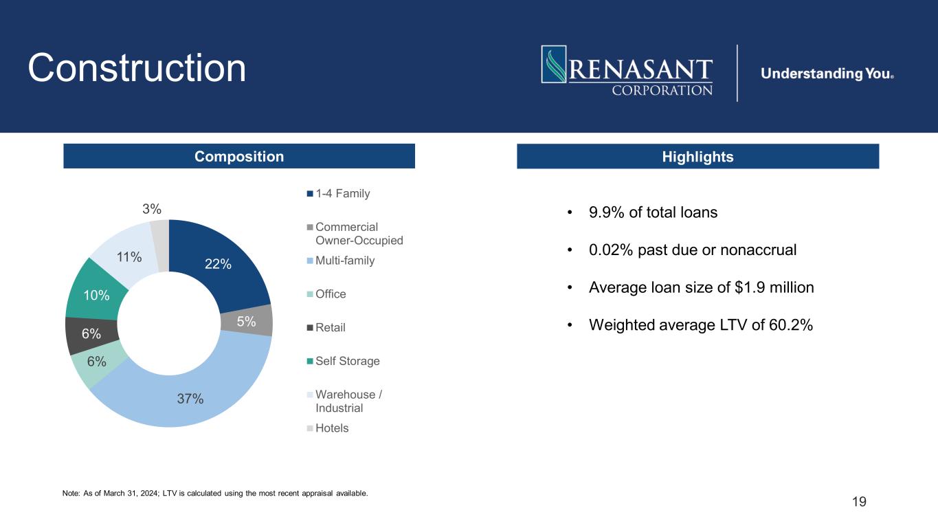 18 Non-Owner Occupied CRE – Term* and Office Non-Owner Occupied CRE – Term* 17% 9% 10% 21% 8% 9% 17% 9% Warehouse/Industrial Hotels Self Storage Multi-family Medical Office Office (non-medical) Retail Senior Housing • 31.8% of total loans • Non-performing loans of 0.24% • 30-89 days past due of 0.08% Note: As of March 31, 2024. LTV is calculated using the most recent appraisal available. *Excludes construction • Average loan size of $2.0 million • Weighted average LTV of 55.7% Office (non-medical) • $340 million portfolio, 2.7% of total loans • 0.24% past due or nonaccrual • Average loan size of $1.0 million • Weighted average LTV of 57.0% • 87% of portfolio < 75% LTV