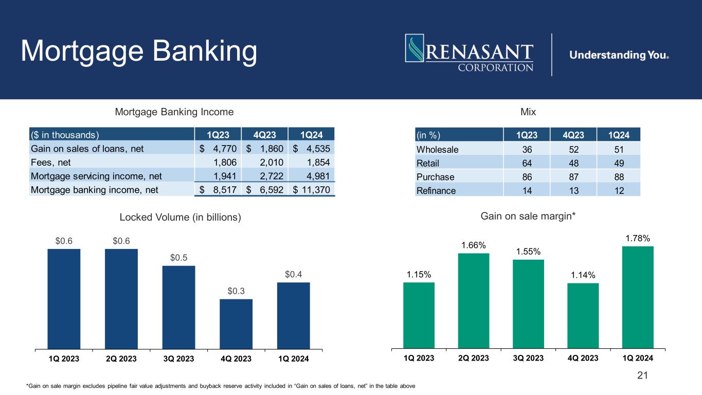 20 ACL / Loss Absorption ($ in thousands) ACL ACL as a % of Loans ACL ACL as a % of Loans Commercial, Financial, Agricultural 43,980$ 2.35 45,922$ 2.46 Lease Financing Receivables 2,515 2.17 2,554 2.38 Real Estate - 1-4 Family Mortgage 47,270 1.37 47,532 1.39 Real Estate - Commercial Mortgage 77,048 1.40 78,783 1.37 Real Estate - Construction 18,612 1.40 17,317 1.39 Installment loans to individuals 9,153 8.84 8,944 9.16 Allowance for Credit Losses on Loans 198,578 1.61 201,052 1.61 Allowance for Credit Losses on Deferred Interest 1,245 1,245 Reserve for Unfunded Commitments 16,918 16,718 Total Reserves 216,741 219,015 Purchase Accounting Discounts 8,593 7,635 Total Loss Absorption Capacity 225,334$ 226,650$ 3/31/202412/31/2023