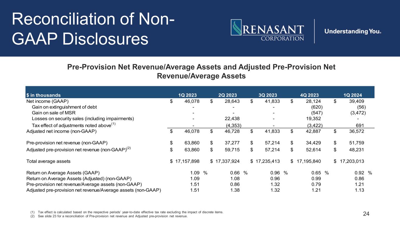 23 Reconciliation of Non- GAAP Disclosures Pre-Provision Net Revenue and Adjusted Pre-Provision Net Revenue $ in thousands 1Q 2023 2Q 2023 3Q 2023 4Q 2023 1Q 2024 Net income (GAAP) 46,078$ 28,643$ 41,833$ 28,124$ 39,409$ Income taxes 11,322 6,634 10,766 3,787 9,912 Provision for credit losses (including unfunded commitments) 6,460 2,000 4,615 2,518 2,438 Pre-provision net revenue (non-GAAP) 63,860$ 37,277$ 57,214$ 34,429$ 51,759$ Gain on extinguishment of debt - - - (620) (56) Gain on sale of MSR - - - (547) (3,472) Losses on security sales (including impairments) - 22,438 - 19,352 - Adjusted pre-provision net revenue (non-GAAP) 63,860$ 59,715$ 57,214$ 52,614$ 48,231$