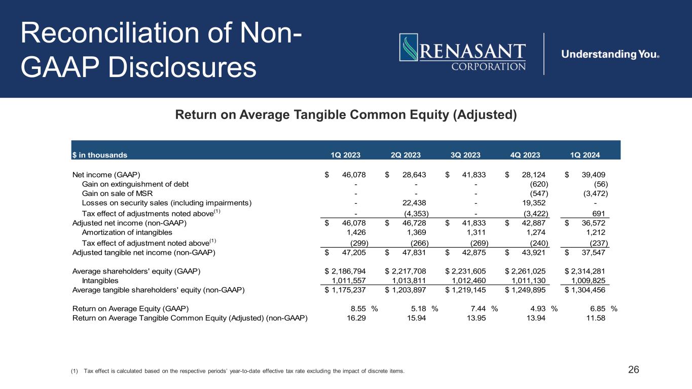25 Reconciliation of Non- GAAP Disclosures Adjusted Diluted Earnings Per Share (1) Tax effect is calculated based on the respective periods’ year-to-date effective tax rate excluding the impact of discrete items. $ in thousands 1Q 2023 2Q 2023 3Q 2023 4Q 2023 1Q 2024 Net income (GAAP) 46,078$ 28,643$ 41,833$ 28,124$ 39,409$ Gain on extinguishment of debt - - - (620) (56) Gain on sale of MSR - - - (547) (3,472) Losses on security sales (including impairments) - 22,438 - 19,352 - Tax effect of adjustments noted above(1) - (4,353) - (3,422) 691 Adjusted net income (non-GAAP) 46,078$ 46,728$ 41,833$ 42,887$ 36,572$ Diluted shares outstanding (average) 56,270,219 56,395,653 56,523,887 56,611,217 56,531,078 Diluted EPS (GAAP) 0.82$ 0.51$ 0.74$ 0.50$ 0.70$ Adjusted Diluted EPS (non-GAAP) 0.82$ 0.83$ 0.74$ 0.76$ 0.65$