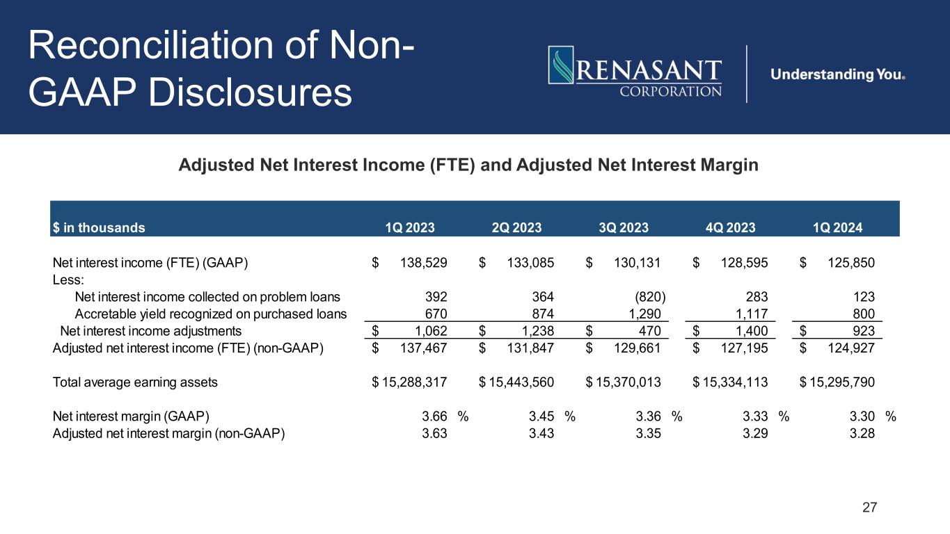 26 Reconciliation of Non- GAAP Disclosures Return on Average Tangible Common Equity (Adjusted) (1) Tax effect is calculated based on the respective periods’ year-to-date effective tax rate excluding the impact of discrete items. $ in thousands 1Q 2023 2Q 2023 3Q 2023 4Q 2023 1Q 2024 Net income (GAAP) 46,078$ 28,643$ 41,833$ 28,124$ 39,409$ Gain on extinguishment of debt - - - (620) (56) Gain on sale of MSR - - - (547) (3,472) Losses on security sales (including impairments) - 22,438 - 19,352 - Tax effect of adjustments noted above(1) - (4,353) - (3,422) 691 Adjusted net income (non-GAAP) 46,078$ 46,728$ 41,833$ 42,887$ 36,572$ Amortization of intangibles 1,426 1,369 1,311 1,274 1,212 Tax effect of adjustment noted above(1) (299) (266) (269) (240) (237) Adjusted tangible net income (non-GAAP) 47,205$ 47,831$ 42,875$ 43,921$ 37,547$ Average shareholders' equity (GAAP) 2,186,794$ 2,217,708$ 2,231,605$ 2,261,025$ 2,314,281$ Intangibles 1,011,557 1,013,811 1,012,460 1,011,130 1,009,825 Average tangible shareholders' equity (non-GAAP) 1,175,237$ 1,203,897$ 1,219,145$ 1,249,895$ 1,304,456$ Return on Average Equity (GAAP) 8.55 % 5.18 % 7.44 % 4.93 % 6.85 % Return on Average Tangible Common Equity (Adjusted) (non-GAAP) 16.29 15.94 13.95 13.94 11.58