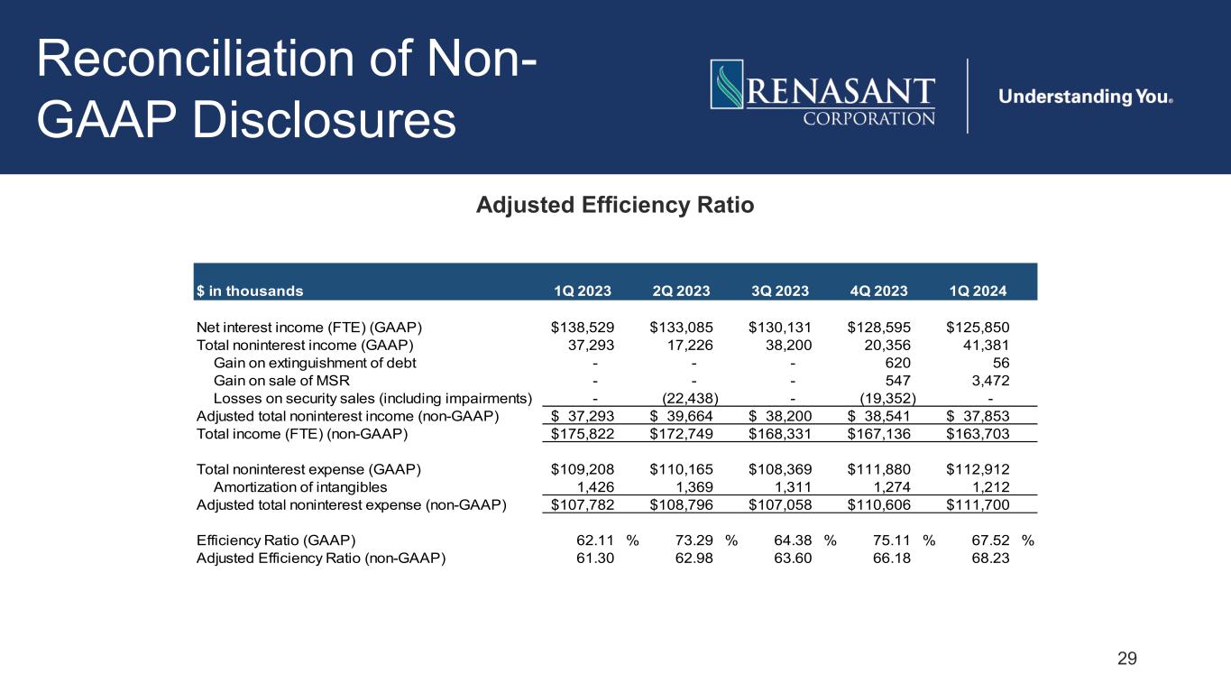 28 Reconciliation of Non- GAAP Disclosures Adjusted Loan Yield $ in thousands 1Q 2023 2Q 2023 3Q 2023 4Q 2023 1Q 2024 Loan interest income (FTE) (GAAP) 163,970$ 175,549$ 183,521$ 190,857$ 194,640$ Less: Net interest income collected on problem loans 392 364 (820) 283 123 Accretable yield recognized on purchased loans 885 874 1,290 1,117 800 Adjusted loan interest income (FTE) (non-GAAP) 162,693$ 174,311$ 183,051$ 189,457$ 193,717$ Total average loans 11,688,534$ 11,877,592$ 12,030,109$ 12,249,429$ 12,407,976$ Loan yield (GAAP) 5.68 % 5.93 % 6.06 % 6.18 % 6.30 % Adjusted loan yield (non-GAAP) 5.64 5.89 6.04 6.14 6.27