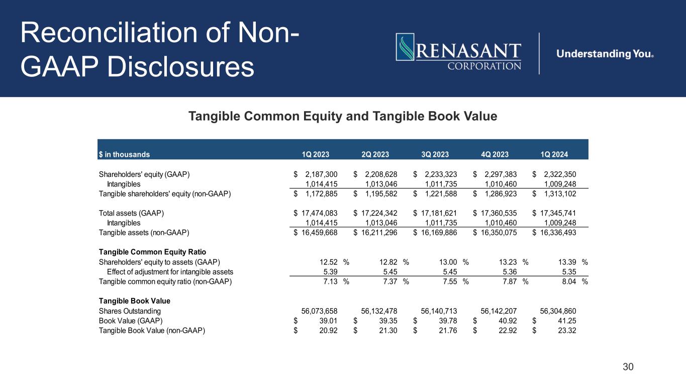29 Reconciliation of Non- GAAP Disclosures Adjusted Efficiency Ratio $ in thousands 1Q 2023 2Q 2023 3Q 2023 4Q 2023 1Q 2024 Net interest income (FTE) (GAAP) 138,529$ 133,085$ 130,131$ 128,595$ 125,850$ Total noninterest income (GAAP) 37,293 17,226 38,200 20,356 41,381 Gain on extinguishment of debt - - - 620 56 Gain on sale of MSR - - - 547 3,472 Losses on security sales (including impairments) - (22,438) - (19,352) - Adjusted total noninterest income (non-GAAP) 37,293$ 39,664$ 38,200$ 38,541$ 37,853$ Total income (FTE) (non-GAAP) 175,822$ 172,749$ 168,331$ 167,136$ 163,703$ Total noninterest expense (GAAP) 109,208$ 110,165$ 108,369$ 111,880$ 112,912$ Amortization of intangibles 1,426 1,369 1,311 1,274 1,212 Adjusted total noninterest expense (non-GAAP) 107,782$ 108,796$ 107,058$ 110,606$ 111,700$ Efficiency Ratio (GAAP) 62.11 % 73.29 % 64.38 % 75.11 % 67.52 % Adjusted Efficiency Ratio (non-GAAP) 61.30 62.98 63.60 66.18 68.23