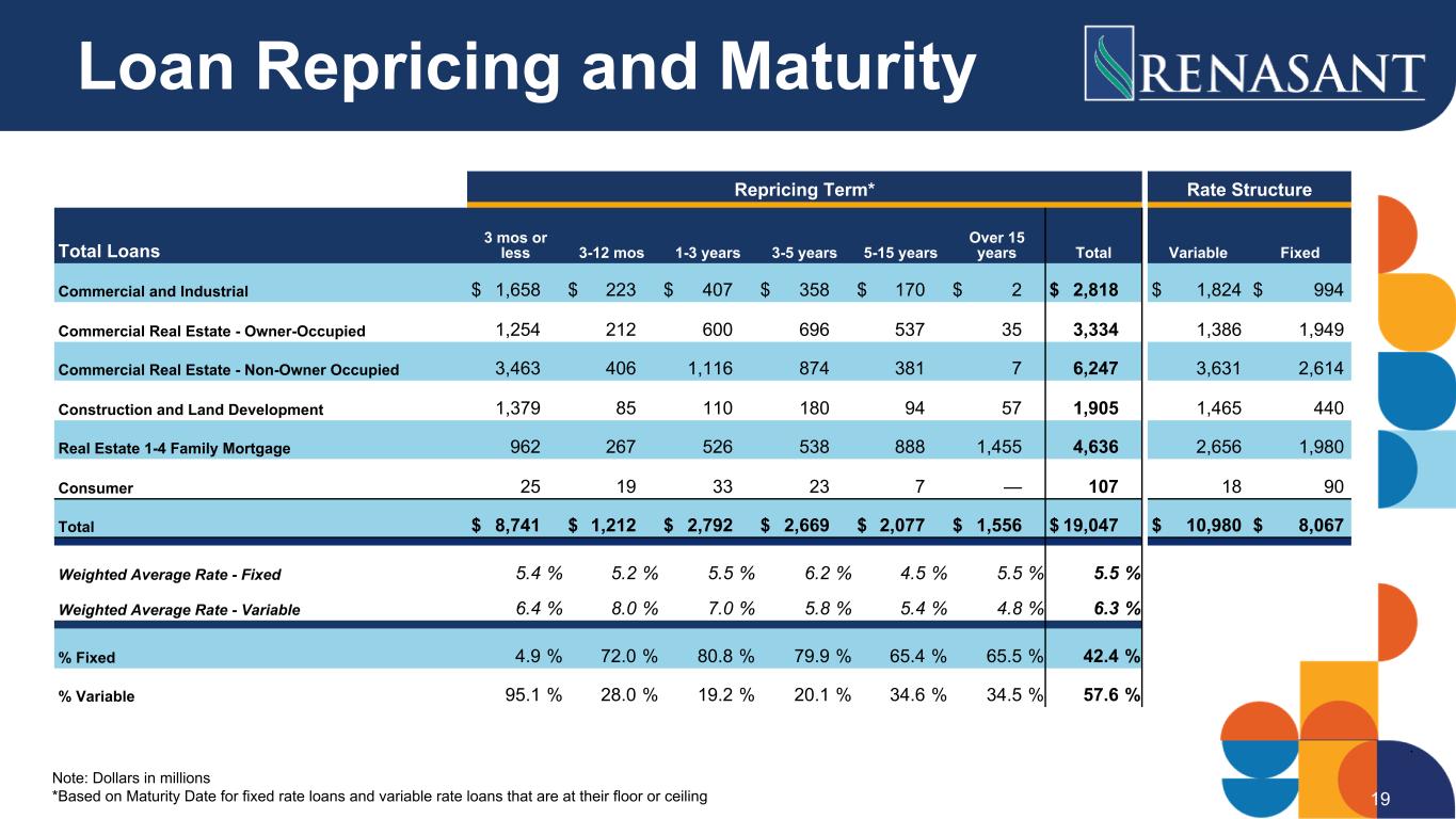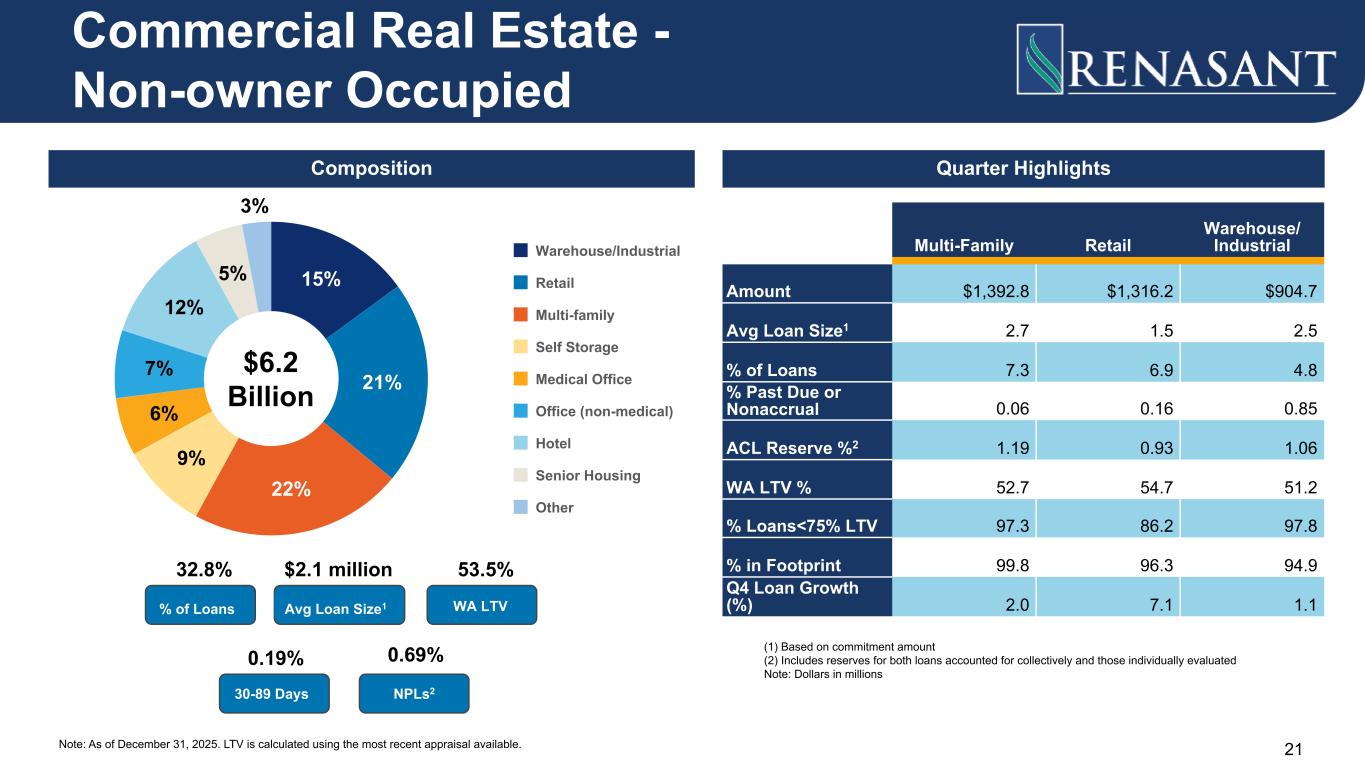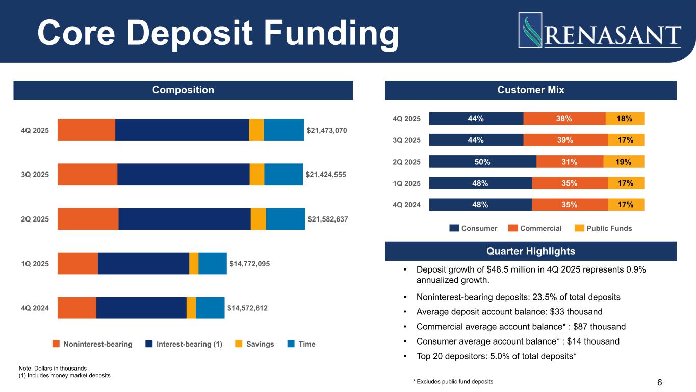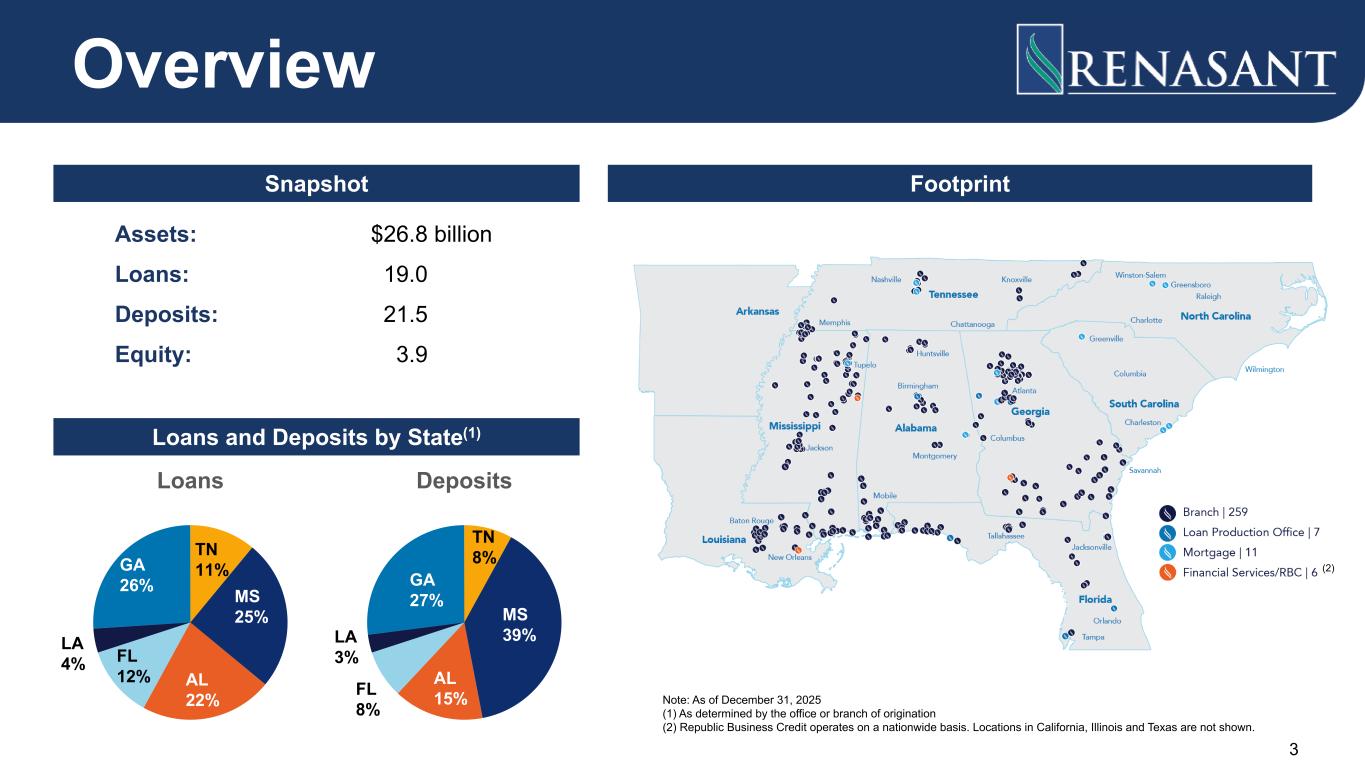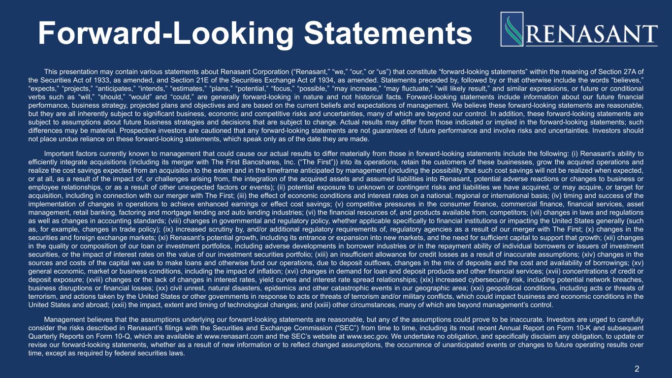 Forward-Looking Statements This presentation may contain various statements about Renasant Corporation (“Renasant,” “we,” “our,” or “us”) that constitute “forward-looking statements” within the meaning of Section 27A of the Securities Act of 1933, as amended, and Section 21E of the Securities Exchange Act of 1934, as amended. Statements preceded by, followed by or that otherwise include the words “believes,” “expects,” “projects,” “anticipates,” “intends,” “estimates,” “plans,” “potential,” “focus,” “possible,” “may increase,” “may fluctuate,” “will likely result,” and similar expressions, or future or conditional verbs such as “will,” “should,” “would” and “could,” are generally forward-looking in nature and not historical facts. Forward-looking statements include information about our future financial performance, business strategy, projected plans and objectives and are based on the current beliefs and expectations of management. We believe these forward-looking statements are reasonable, but they are all inherently subject to significant business, economic and competitive risks and uncertainties, many of which are beyond our control. In addition, these forward-looking statements are subject to assumptions about future business strategies and decisions that are subject to change. Actual results may differ from those indicated or implied in the forward-looking statements; such differences may be material. Prospective investors are cautioned that any forward-looking statements are not guarantees of future performance and involve risks and uncertainties. Investors should not place undue reliance on these forward-looking statements, which speak only as of the date they are made. Important factors currently known to management that could cause our actual results to differ materially from those in forward-looking statements include the following: (i) Renasant’s ability to efficiently integrate acquisitions (including its merger with The First Bancshares, Inc. (“The First”)) into its operations, retain the customers of these businesses, grow the acquired operations and realize the cost savings expected from an acquisition to the extent and in the timeframe anticipated by management (including the possibility that such cost savings will not be realized when expected, or at all, as a result of the impact of, or challenges arising from, the integration of the acquired assets and assumed liabilities into Renasant, potential adverse reactions or changes to business or employee relationships, or as a result of other unexpected factors or events); (ii) potential exposure to unknown or contingent risks and liabilities we have acquired, or may acquire, or target for acquisition, including in connection with our merger with The First; (iii) the effect of economic conditions and interest rates on a national, regional or international basis; (iv) timing and success of the implementation of changes in operations to achieve enhanced earnings or effect cost savings; (v) competitive pressures in the consumer finance, commercial finance, financial services, asset management, retail banking, factoring and mortgage lending and auto lending industries; (vi) the financial resources of, and products available from, competitors; (vii) changes in laws and regulations as well as changes in accounting standards; (viii) changes in governmental and regulatory policy, whether applicable specifically to financial institutions or impacting the United States generally (such as, for example, changes in trade policy); (ix) increased scrutiny by, and/or additional regulatory requirements of, regulatory agencies as a result of our merger with The First; (x) changes in the securities and foreign exchange markets; (xi) Renasant’s potential growth, including its entrance or expansion into new markets, and the need for sufficient capital to support that growth; (xii) changes in the quality or composition of our loan or investment portfolios, including adverse developments in borrower industries or in the repayment ability of individual borrowers or issuers of investment securities, or the impact of interest rates on the value of our investment securities portfolio; (xiii) an insufficient allowance for credit losses as a result of inaccurate assumptions; (xiv) changes in the sources and costs of the capital we use to make loans and otherwise fund our operations, due to deposit outflows, changes in the mix of deposits and the cost and availability of borrowings; (xv) general economic, market or business conditions, including the impact of inflation; (xvi) changes in demand for loan and deposit products and other financial services; (xvii) concentrations of credit or deposit exposure; (xviii) changes or the lack of changes in interest rates, yield curves and interest rate spread relationships; (xix) increased cybersecurity risk, including potential network breaches, business disruptions or financial losses; (xx) civil unrest, natural disasters, epidemics and other catastrophic events in our geographic area; (xxi) geopolitical conditions, including acts or threats of terrorism, and actions taken by the United States or other governments in response to acts or threats of terrorism and/or military conflicts, which could impact business and economic conditions in the United States and abroad; (xxii) the impact, extent and timing of technological changes; and (xxiii) other circumstances, many of which are beyond management’s control. Management believes that the assumptions underlying our forward-looking statements are reasonable, but any of the assumptions could prove to be inaccurate. Investors are urged to carefully consider the risks described in Renasant’s filings with the Securities and Exchange Commission (“SEC”) from time to time, including its most recent Annual Report on Form 10-K and subsequent Quarterly Reports on Form 10-Q,