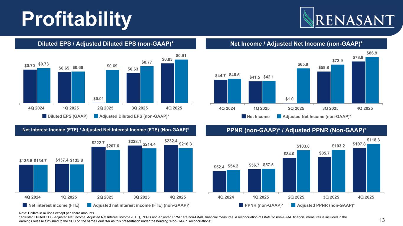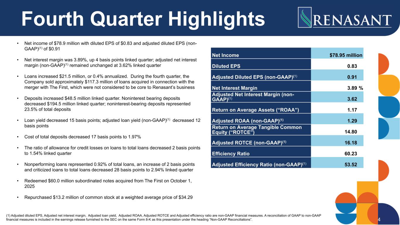 •Net income for the fourth quarter of 2025 was $78.9 million, which includes merger and conversion related expenses of $10.6 million; diluted EPS and adjusted diluted EPS (non-GAAP)(1) were $0.83 and $0.91, respectively