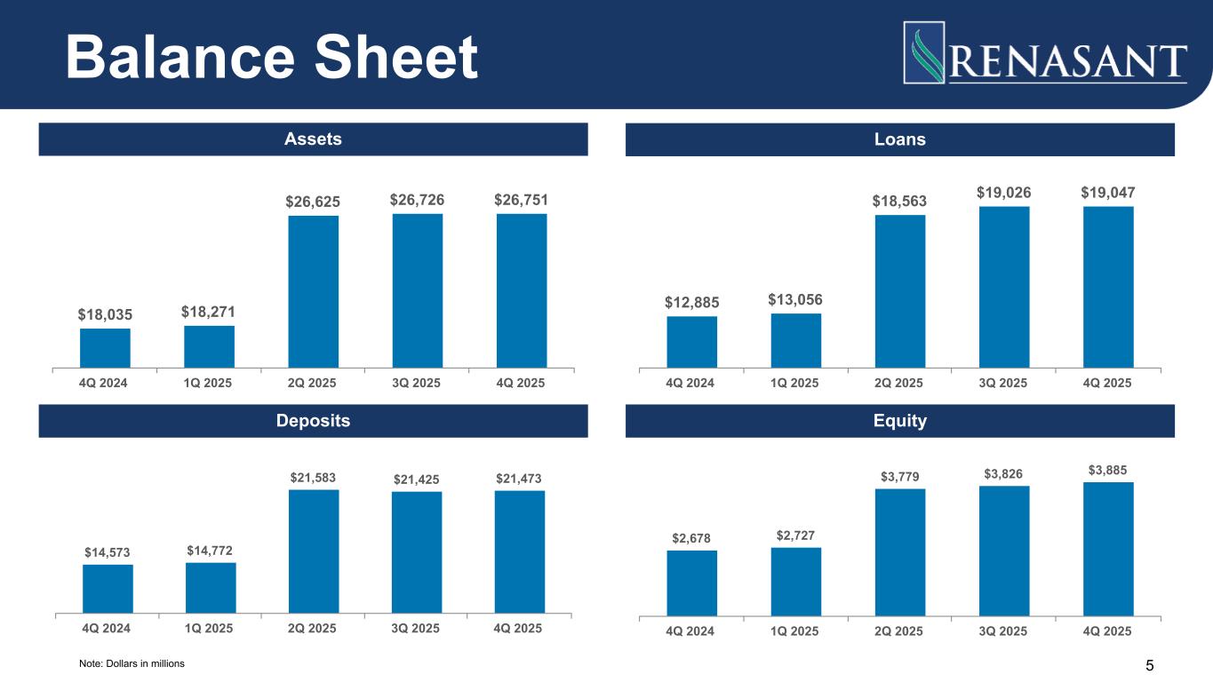 Fourth Quarter Highlights • Net income of $78.9 million with diluted EPS of $0.83 and adjusted diluted EPS (non- GAAP)(1) of $0.91 • Net interest margin was 3.89%, up 4 basis points linked quarter; adjusted net interest margin (non-GAAP)(1) remained unchanged at 3.62% linked quarter • Loans increased $21.5 million, or 0.4% annualized. During the fourth quarter, the Company sold approximately $117.3 million of loans acquired in connection with the merger with The First, which were not considered to be core to Renasant’s business • Deposits increased $48.5 million linked quarter. Noninterest bearing deposits decreased $194.5 million linked quarter; noninterest-bearing deposits represented 23.5% of total deposits • Loan yield decreased 15 basis points; adjusted loan yield (non-GAAP)(1) decreased 12 basis points • Cost of total deposits decreased 17 basis points to 1.97% • The ratio of allowance for credit losses on loans to total loans decreased 2 basis points to 1.54% linked quarter • Nonperforming loans represented 0.92% of total loans, an increase of 2 basis points and criticized loans to total loans decreased 28 basis points to 2.94% linked quarter • Redeemed $60.0 million subordinated notes acquired from The First on October 1, 2025 • Repurchased $13.2 million of common stock at a weighted average price of $34.29 (1) Adjusted diluted EPS, Adjusted net interest margin, Adjusted loan yield, Adjusted ROAA, Adjusted ROTCE and Adjusted efficiency ratio are non-GAAP financial measures. A reconciliation of GAAP to non-GAAP financial measures is included in the earnings release furnished to the SEC on the same Form 8-K as this presentation under the heading “Non-GAAP Reconciliations”. 4 Net Income $78.95 million Diluted EPS 0.83 Adjusted Diluted EPS (non-GAAP)(1) 0.91 Net Interest Margin 3.89 % Adjusted Net Interest Margin (non- GAAP)(1) 3.62 Return on Average Assets (“ROAA”) 1.17 Adjusted ROAA (non-GAAP)(1) 1.29 Return on Average Tangible Common Equity (“ROTCE”) 14.80 Adjusted ROTCE (non-GAAP)(1) 16.18 Efficiency Ratio 60.23 Adjusted Efficiency Ratio (non-GAAP)(1) 53.52