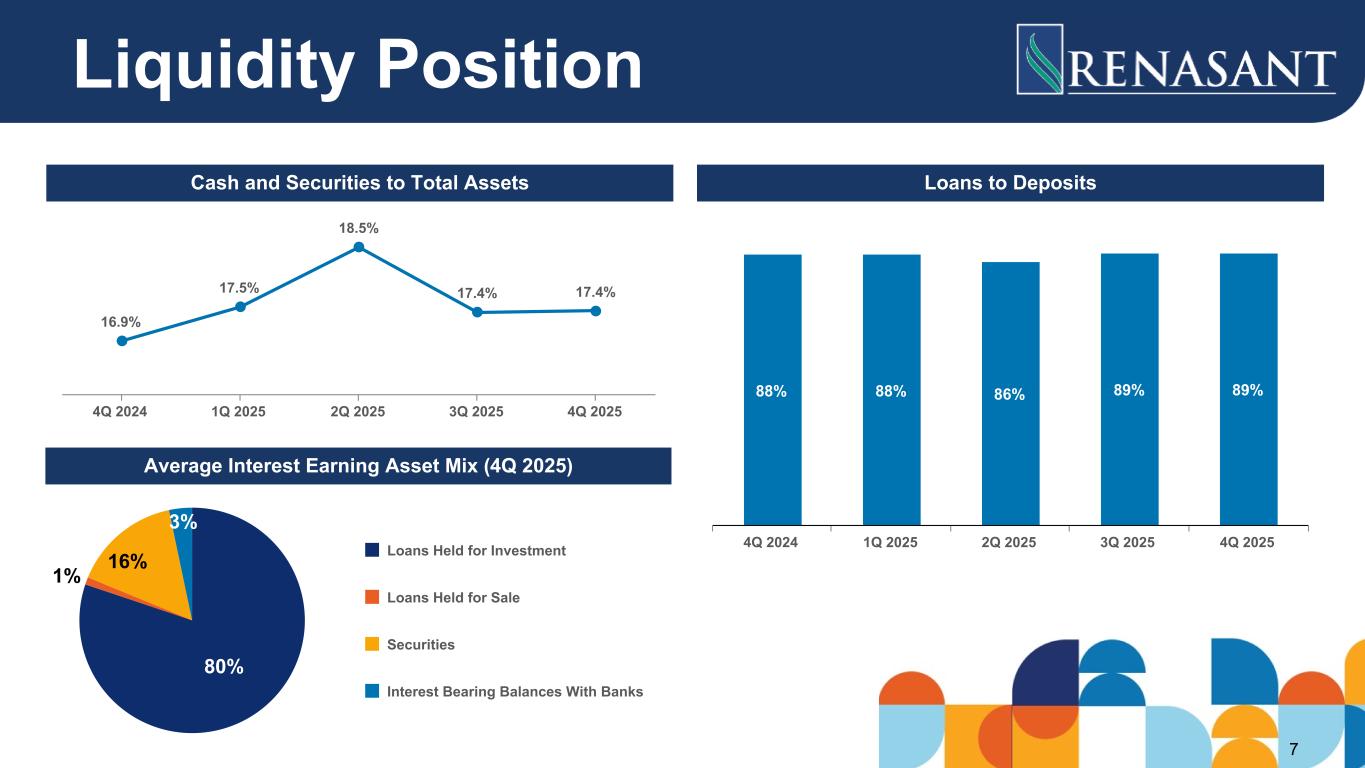 Note: Dollars in thousands (1) Includes money market deposits Composition Quarter Highlights 6 $21,473,070 $21,424,555 $21,582,637 $14,772,095 $14,572,612 Noninterest-bearing Interest-bearing (1) Savings Time 4Q 2025 3Q 2025 2Q 2025 1Q 2025 4Q 2024 Core Deposit Funding • Deposit growth of $48.5 million in 4Q 2025 represents 0.9% annualized growth. • Noninterest-bearing deposits: 23.5% of total deposits • Average deposit account balance: $33 thousand • Commercial average account balance* : $87 thousand • Consumer average account balance* : $14 thousand • Top 20 depositors: 5.0% of total deposits* Customer Mix 44% 44% 50% 48% 48% 38% 39% 31% 35% 35% 18% 17% 19% 17% 17% Consumer Commercial Public Funds 4Q 2025 3Q 2025 2Q 2025 1Q 2025 4Q 2024 * Excludes public fund deposits