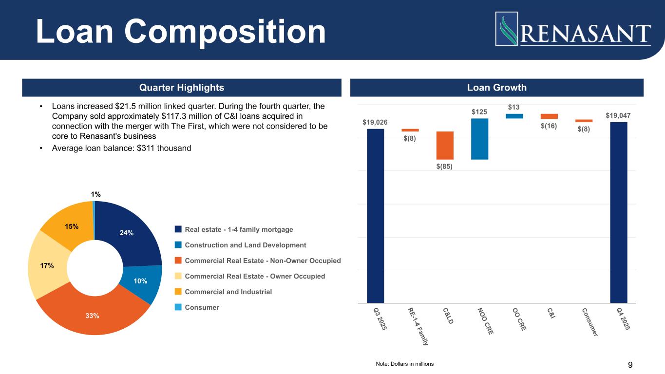 •Net loan charge-offs for the fourth quarter of 2025 were $9.1 million, which includes $2.5 million recognized in connection with the aforementioned sale of the acquired $117.3 million loan portfolio