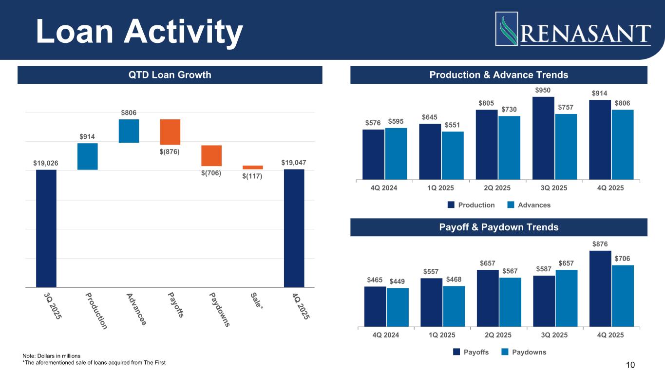 Loan Growth $19,026 $(8) $(85) $125 $13 $(16) $(8) $19,047 Q 3 2025 RE-1-4 Fam ily C&LD NO O CRE O O CRE C&I Consum er Q 4 2025 Quarter Highlights • Loans increased $21.5 million linked quarter. During the fourth quarter, the Company sold approximately $117.3 million of C&I loans acquired in connection with the merger with The First, which were not considered to be core to Renasant's business • Average loan balance: $311 thousand 24% 10% 33% 17% 15% 1% Real estate - 1-4 family mortgage Construction and Land Development Commercial Real Estate - Non-Owner Occupied Commercial Real Estate - Owner Occupied Commercial and Industrial Consumer Loan Composition 9Note: Dollars in millions
