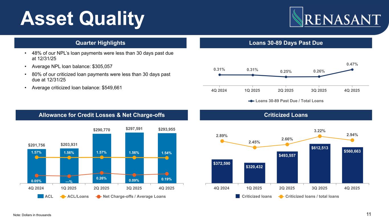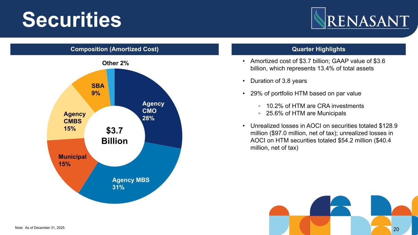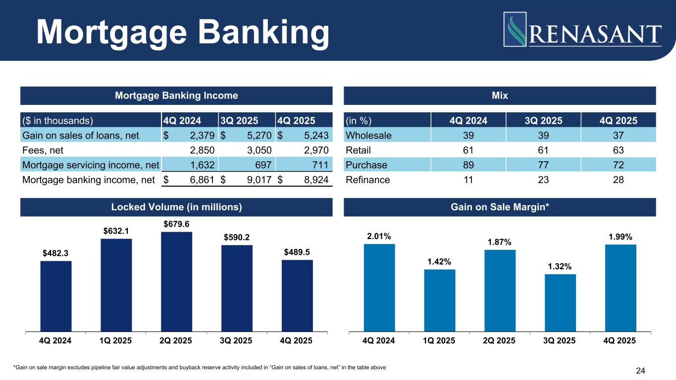 •Mortgage banking income decreased $0.1 million linked quarter. The mortgage division generated $489.5 million in interest rate lock volume in the fourth quarter of 2025, down $100.7 million linked quarter. Gain on sale margin was 1.99% for the fourth quarter of 2025, up 67 basis points linked quarter