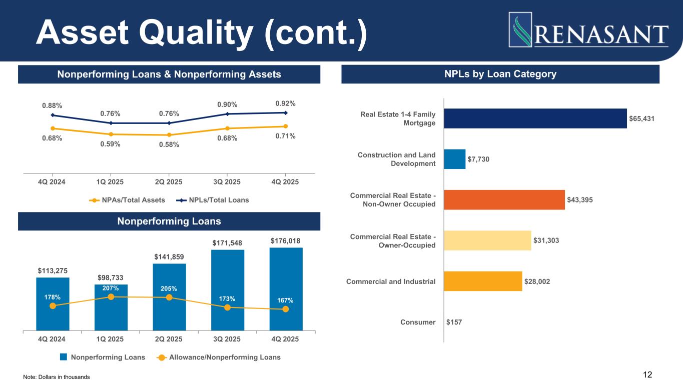 11 $201,756 $203,931 $290,770 $297,591 $293,955 1.57% 1.56% 1.57% 1.56% 1.54% 0.05% —% 0.26% 0.09% 0.19% ACL ACL/Loans Net Charge-offs / Average Loans 4Q 2024 1Q 2025 2Q 2025 3Q 2025 4Q 2025 $372,590 $320,432 $493,557 $612,513 $560,663 2.89% 2.45% 2.66% 3.22% 2.94% Criticized loans Criticized loans / total loans 4Q 2024 1Q 2025 2Q 2025 3Q 2025 4Q 2025 Asset Quality Criticized Loans Note: Dollars in thousands Allowance for Credit Losses & Net Charge-offs 0.31% 0.31% 0.25% 0.26% 0.47% Loans 30-89 Past Due / Total Loans 4Q 2024 1Q 2025 2Q 2025 3Q 2025 4Q 2025 Loans 30-89 Days Past DueQuarter Highlights • 48% of our NPL’s loan payments were less than 30 days past due at 12/31/25 • Average NPL loan balance: $305,057 • 80% of our criticized loan payments were less than 30 days past due at 12/31/25 • Average criticized loan balance: $549,661
