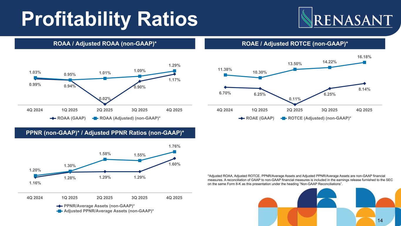 $0.70 $0.65 $0.01 $0.63 $0.83 $0.73 $0.66 $0.69 $0.77 $0.91 Diluted EPS (GAAP) Adjusted Diluted EPS (non-GAAP)* 4Q 2024 1Q 2025 2Q 2025 3Q 2025 4Q 2025 $135.5 $137.4 $222.7 $228.1 $232.4 $134.7 $135.8 $207.6 $214.4 $216.3 Net interest income (FTE) Adjusted net interest income (FTE) (non-GAAP)* 4Q 2024 1Q 2025 2Q 2025 3Q 2025 4Q 2025 Note: Dollars in millions except per share amounts. *Adjusted Diluted EPS, Adjusted Net Income, Adjusted Net Interest Income (FTE), PPNR and Adjusted PPNR are non-GAAP financial measures. A reconciliation of GAAP to non-GAAP financial measures is included in the earnings release furnished to the SEC on the same Form 8-K as this presentation under the heading “Non-GAAP Reconciliations”. $52.4 $56.7 $84.0 $85.7 $107.8 $54.2 $57.5 $103.0 $103.2 $118.3 PPNR (non-GAAP)* Adjusted PPNR (non-GAAP)* 4Q 2024 1Q 2025 2Q 2025 3Q 2025 4Q 2025 $44.7 $41.5 $1.0 $59.8 $78.9 $46.5 $42.1 $65.9 $72.9 $86.9 Net Income Adjusted Net Income (non-GAAP)* 4Q 2024 1Q 2025 2Q 2025 3Q 2025 4Q 2025 13 Profitability Diluted EPS / Adjusted Diluted EPS (non-GAAP)* Net Income / Adjusted Net Income (non-GAAP)* PPNR (non-GAAP)* / Adjusted PPNR (Non-GAAP)*Net Interest Income (FTE) / Adjusted Net Interest Income (FTE) (Non-GAAP)*