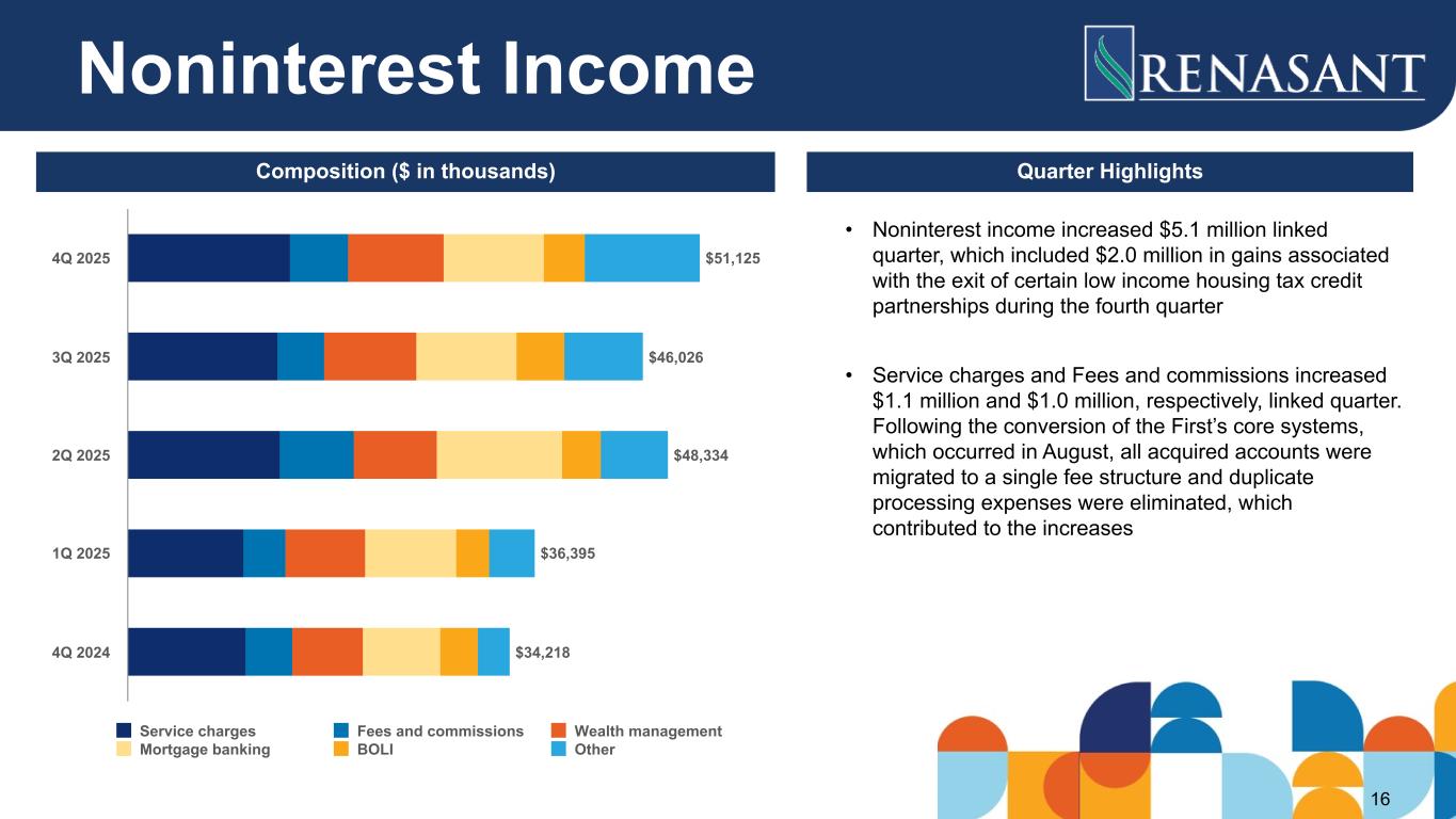 3.36% 3.45% 3.85% 3.85% 3.89% 3.34% 3.42% 3.58% 3.62% 3.62% Net Interest Margin Adjusted Net Interest Margin (FTE)(non-GAAP)* 4Q 2024 1Q 2025 2Q 2025 3Q 2025 4Q 2025 *Adjusted Net Interest Margin (FTE) and Adjusted Loan Yield are non-GAAP financial measures. A reconciliation of GAAP to non-GAAP financial measures is included in the earnings release furnished to the SEC on the same Form 8-K as this presentation under the heading “Non-GAAP Reconciliations”. 6.29% 6.24% 6.63% 6.60% 6.45% 6.27% 6.19% 6.18% 6.23% 6.11% Loan yield Adjusted Loan Yield (non-GAAP)* 4Q 2024 1Q 2025 2Q 2025 3Q 2025 4Q 2025 • Scheduled accretion and accelerated accretion recognized on acquired loans were $11.8 million and $1.8 million, respectively, for the fourth quarter of 2025, which included scheduled credit accretion and accelerated credit accretion of $4.5 million and $1.6 million, respectively 15 Net Interest Margin (FTE), Loan Yield and Cost of Deposits 2.35% 2.22% 2.12% 2.14% 1.97% 3.09% 2.89% 2.82% 2.83% 2.60% Total cost of deposits Cost of total interest-bearing deposits 4Q 2024 1Q 2025 2Q 2025 3Q 2025 4Q 2025 Net Interest Margin (FTE) / Adjusted Net Interest Margin (FTE)(non-GAAP)* Loan Yield / Adjusted Loan Yield (non-GAAP)* Cost of Deposits Accretion