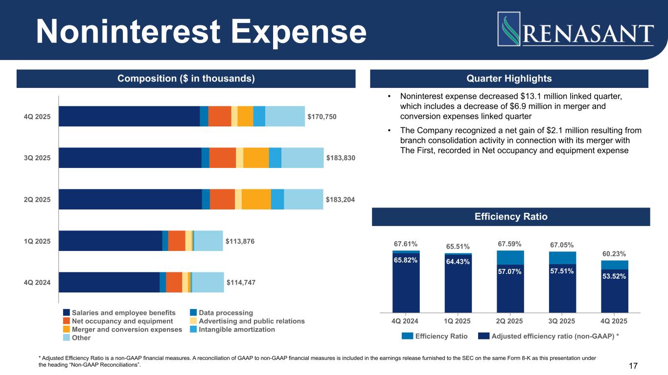 • Noninterest income increased $5.1 million linked quarter, which included $2.0 million in gains associated with the exit of certain low income housing tax credit partnerships during the fourth quarter • Service charges and Fees and commissions increased $1.1 million and $1.0 million, respectively, linked quarter. Following the conversion of the First’s core systems, which occurred in August, all acquired accounts were migrated to a single fee structure and duplicate processing expenses were eliminated, which contributed to the increases 16 $51,125 $46,026 $48,334 $36,395 $34,218 Service charges Fees and commissions Wealth management Mortgage banking BOLI Other 4Q 2025 3Q 2025 2Q 2025 1Q 2025 4Q 2024 Noninterest Income Composition ($ in thousands) Quarter Highlights