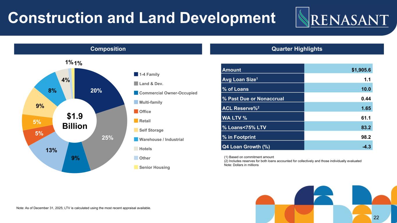 15% 21% 22% 9% 6% 7% 12% 5% 3% Warehouse/Industrial Retail Multi-family Self Storage Medical Office Office (non-medical) Hotel Senior Housing Other Quarter Highlights Note: As of December 31, 2025. LTV is calculated using the most recent appraisal available. % of Loans Avg Loan Size1 32.8% $2.1 million WA LTV 53.5% 0.19% 30-89 Days 0.69% NPLs2 Multi-Family Retail Warehouse/ Industrial Amount $1,392.8 $1,316.2 $904.7 Avg Loan Size1 2.7 1.5 2.5 % of Loans 7.3 6.9 4.8 % Past Due or Nonaccrual 0.06 0.16 0.85 ACL Reserve %2 1.19 0.93 1.06 WA LTV % 52.7 54.7 51.2 % Loans<75% LTV 97.3 86.2 97.8 % in Footprint 99.8 96.3 94.9 Q4 Loan Growth (%) 2.0 7.1 1.1 (1) Based on commitment amount (2) Includes reserves for both loans accounted for collectively and those individually evaluated Note: Dollars in millions 21 Commercial Real Estate - Non-owner Occupied $6.2 Billion Composition
