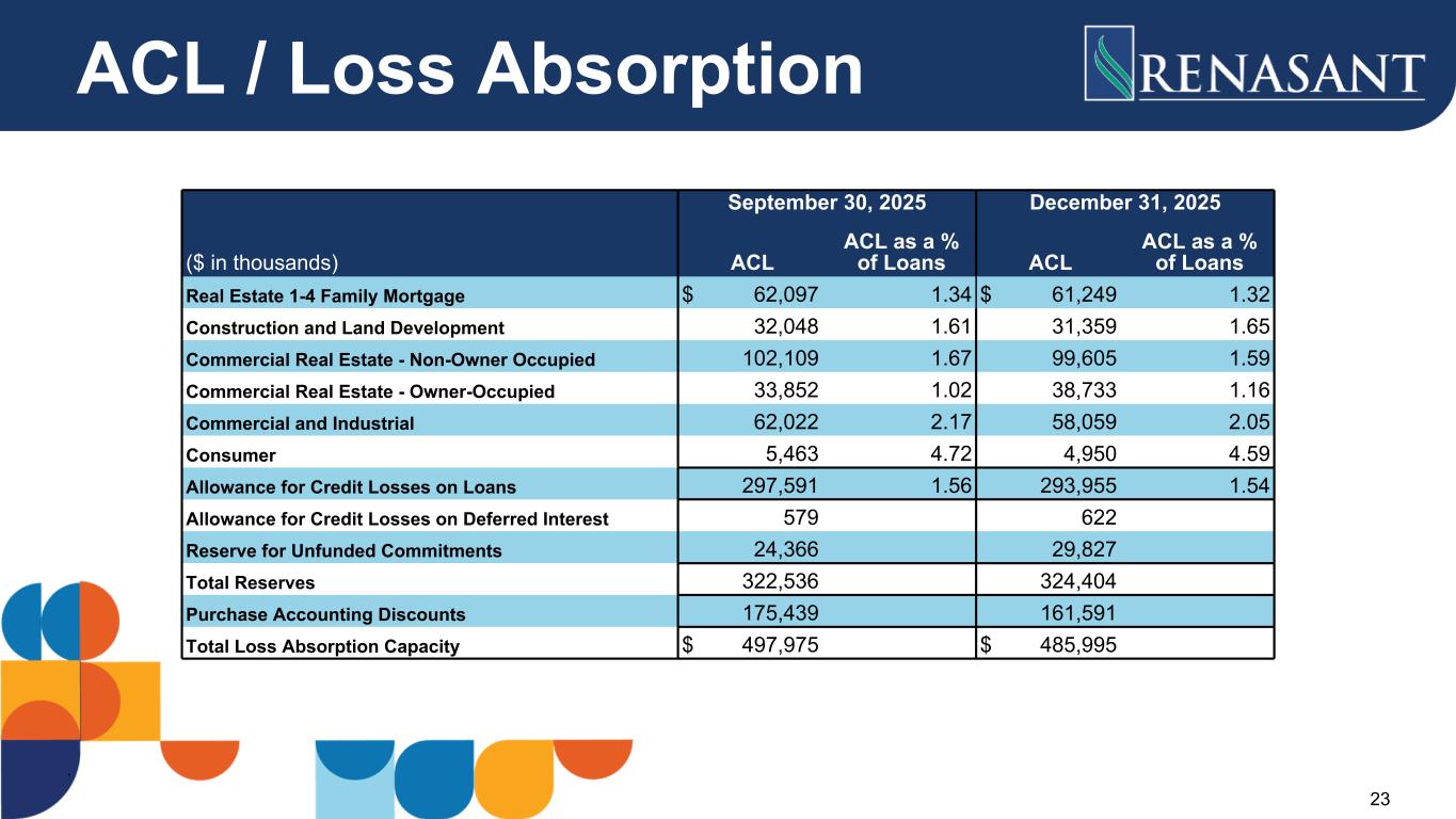 •The ratio of the allowance for credit losses on loans to total loans was 1.54% at December 31, 2025, down 2 basis points linked quarter